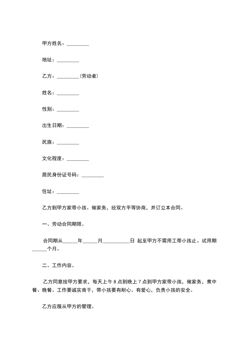 主要从事甲方孩子(_______)看护工作,双方应以诚相待,相互说明有关必要信息,不得做假欺骗。