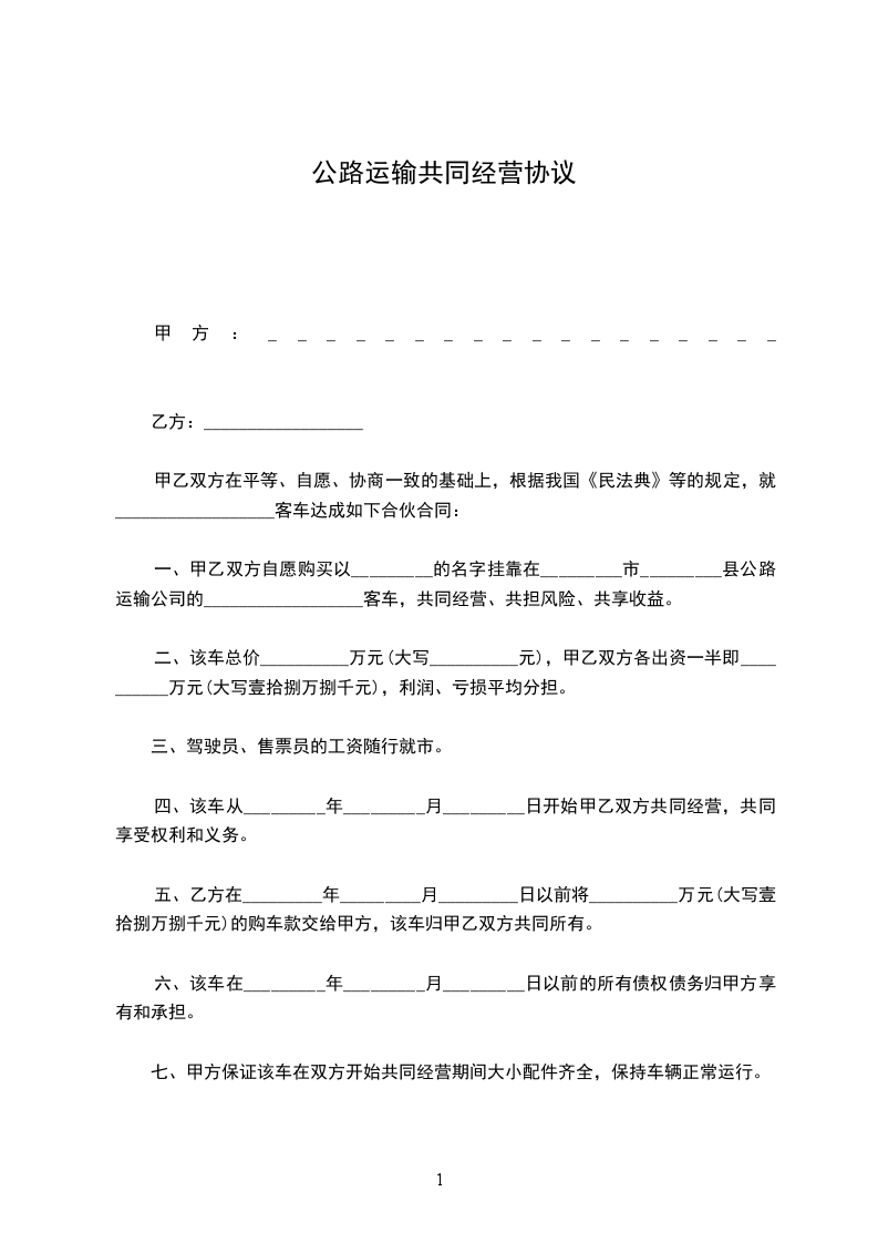 甲乙双方在平等、自愿、协商一致的基础上,根据我国《民法典》等的规定,就__________________客车达成如下合伙合同: