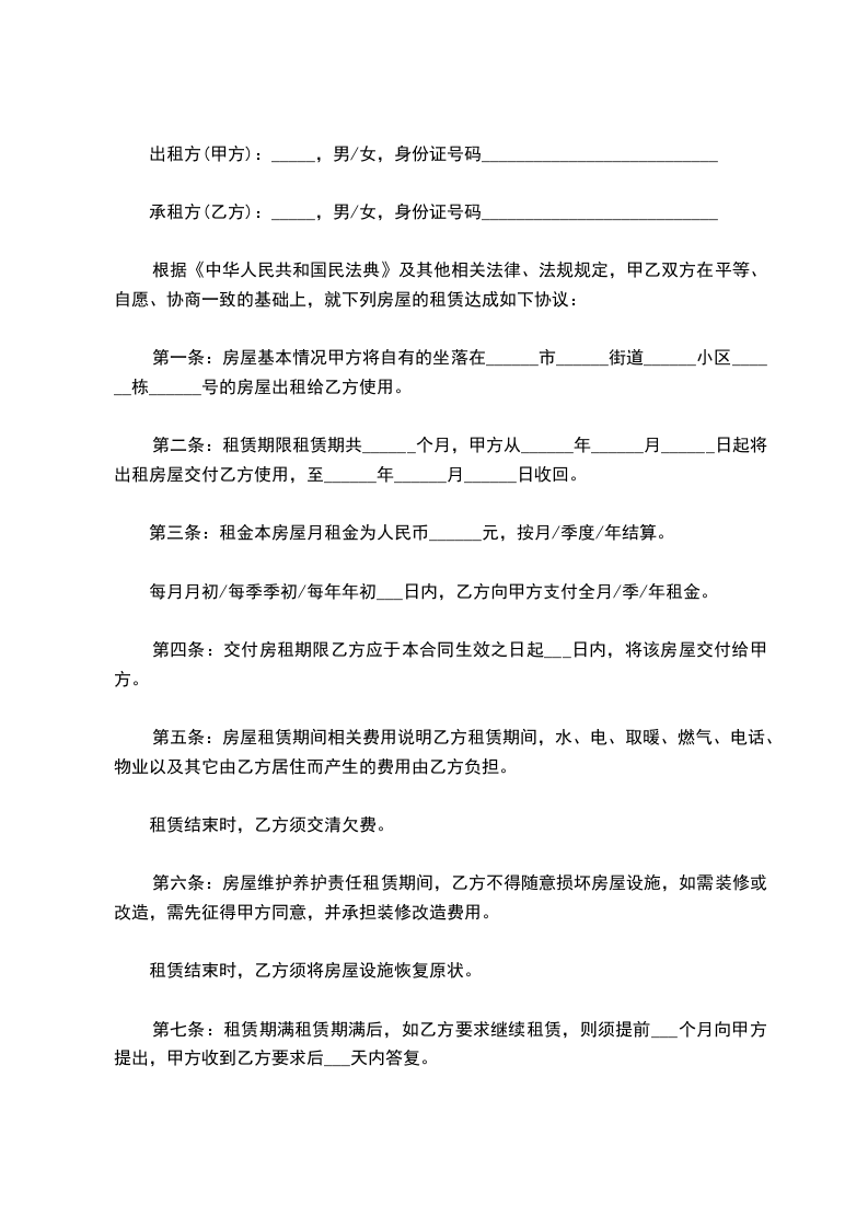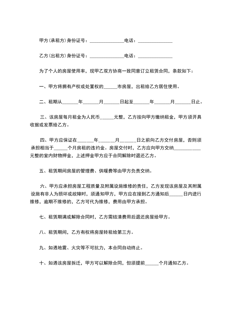 承租方(乙方):_____,男/女,身份证号码___________________________
