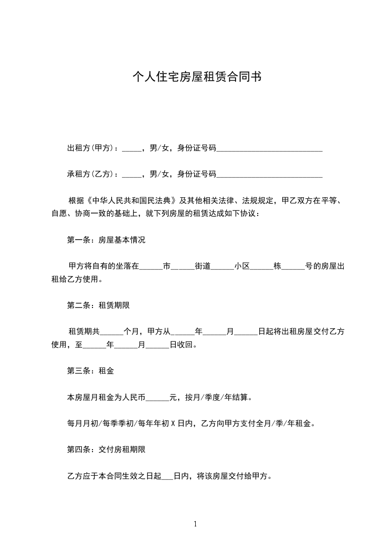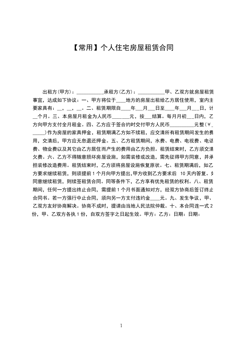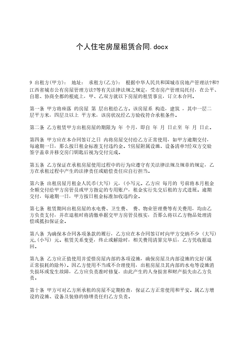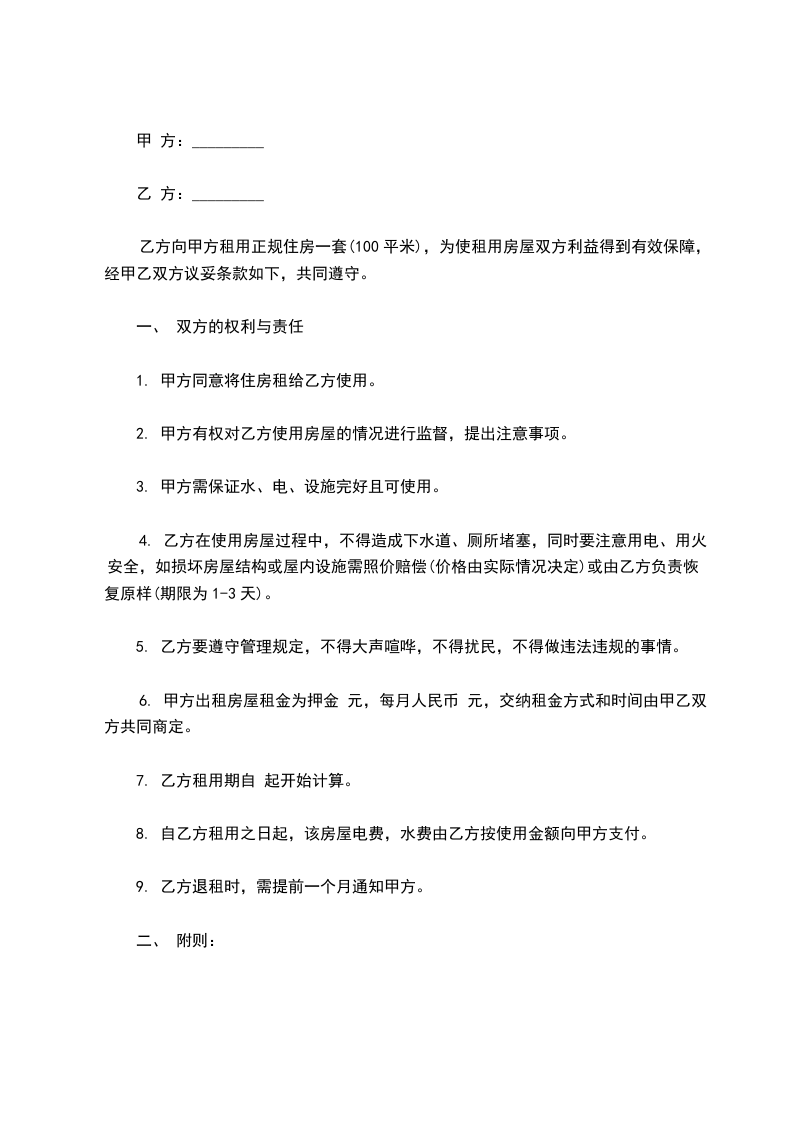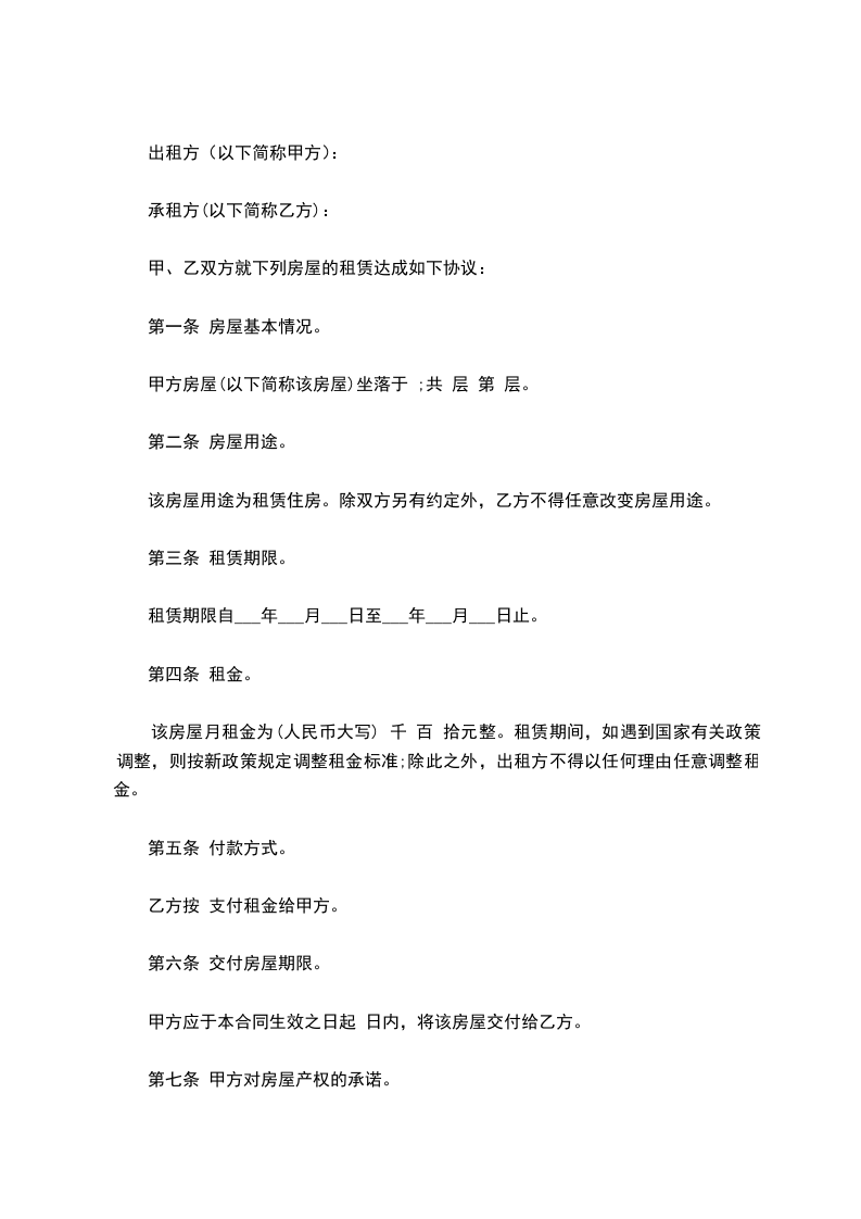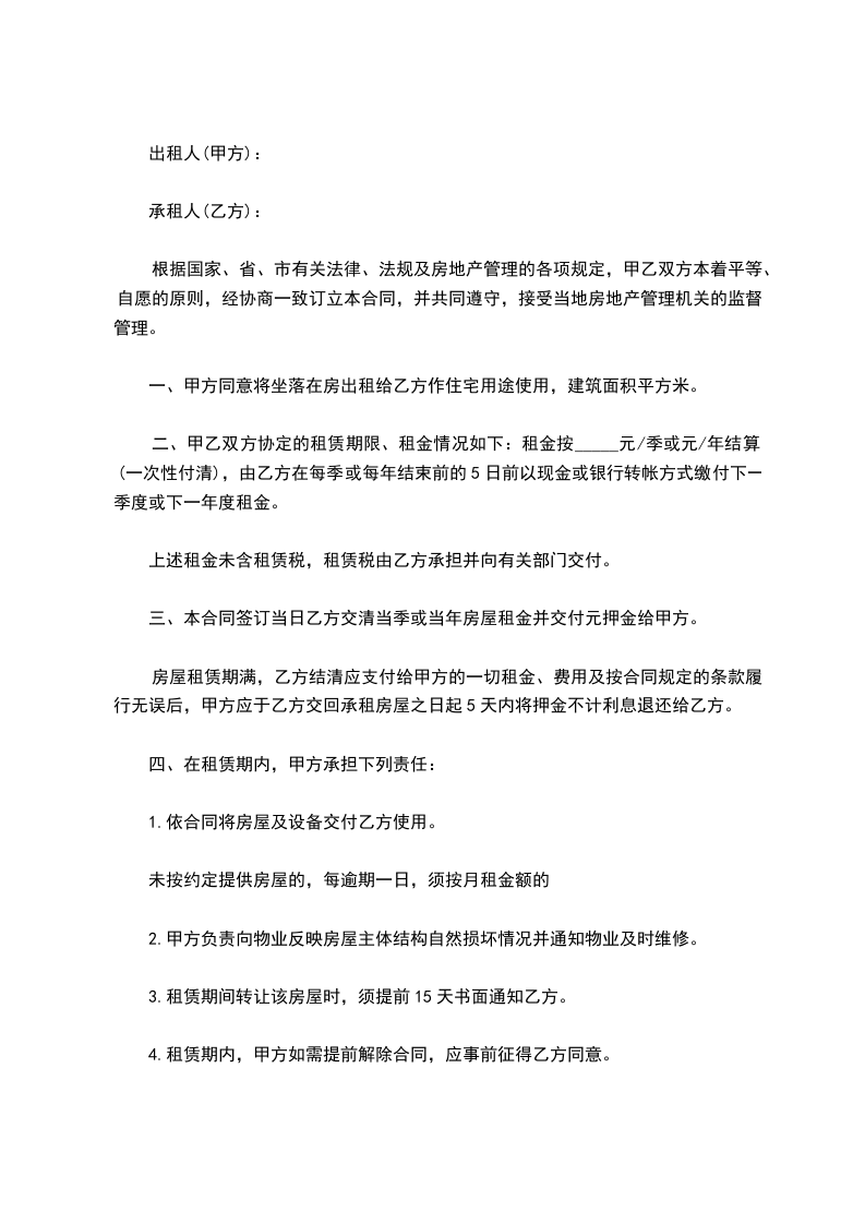 一、甲方同意将坐落在房出租给乙方作住宅用途使用,建筑面积平方米。