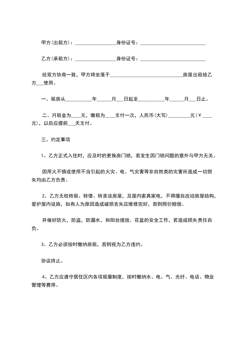 1、乙方正式入住时,应及时的更换房门锁,若发生因门锁问题的意外与甲方无关。