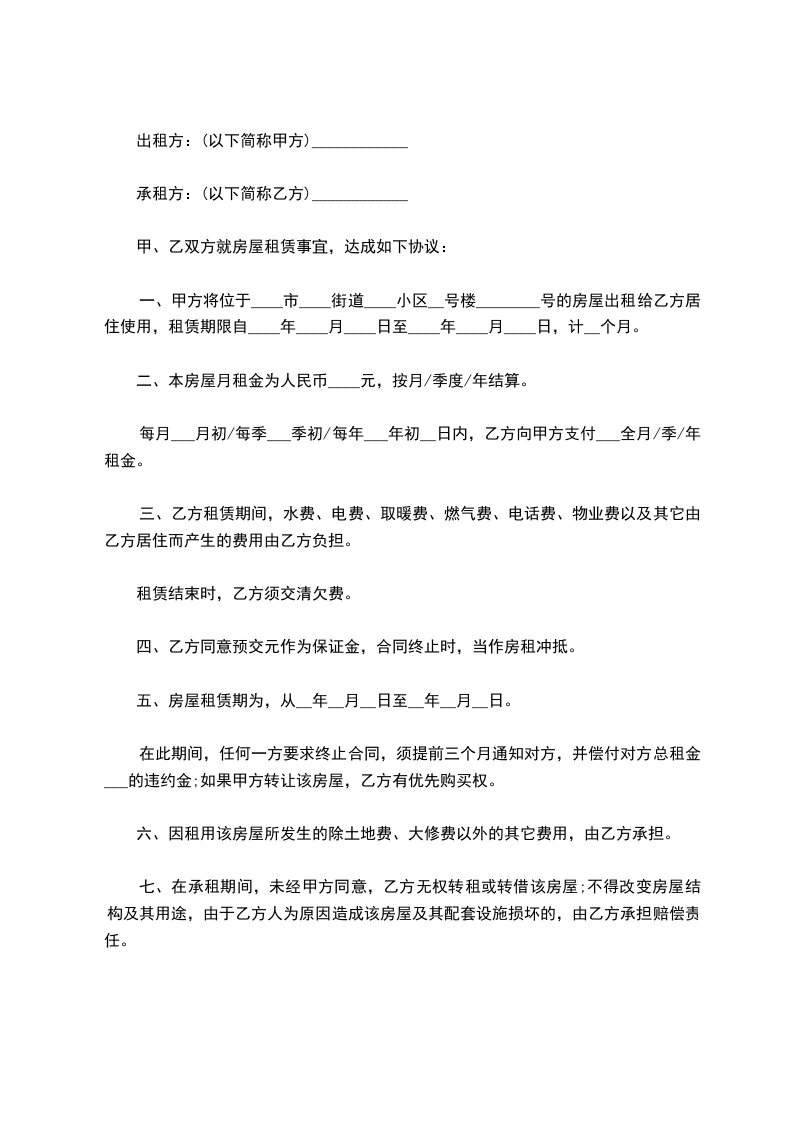 一、甲方将位于____市____街道____小区__号楼________号的房屋出租给乙方居住使用,租赁期限自____年____月____日至____年____月____日,计__个月。