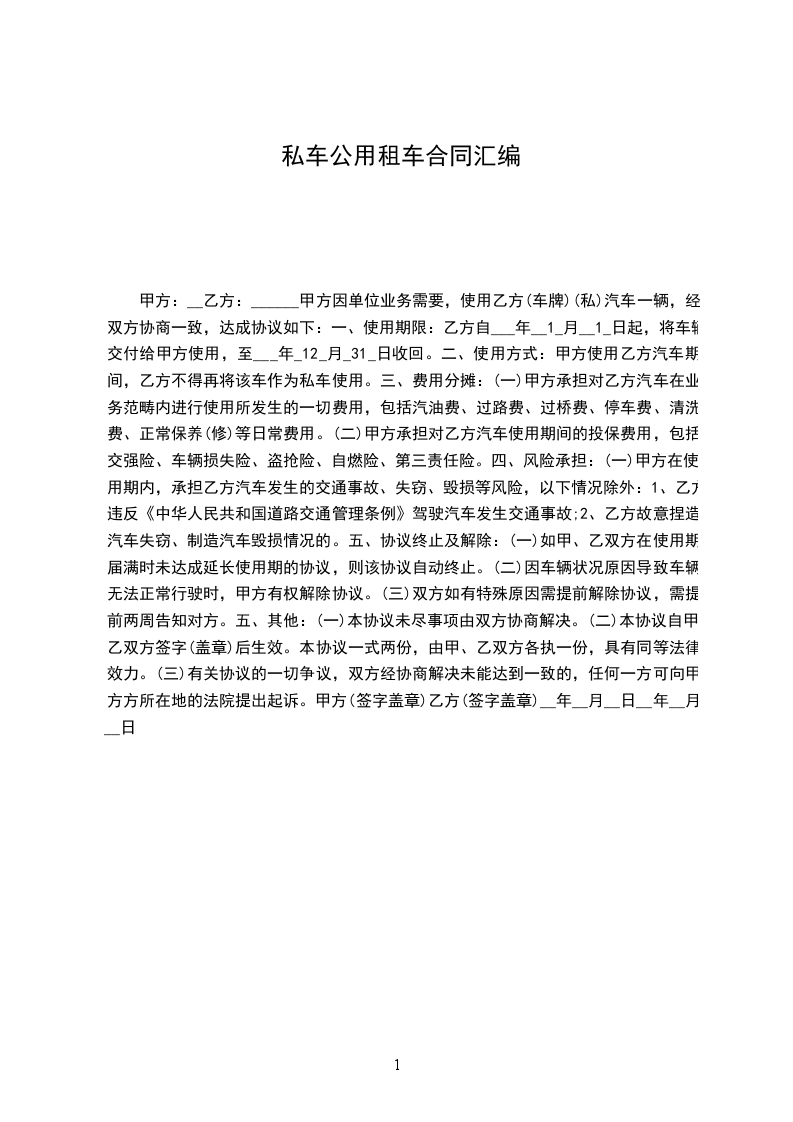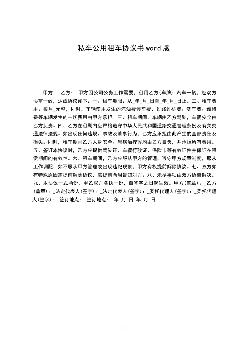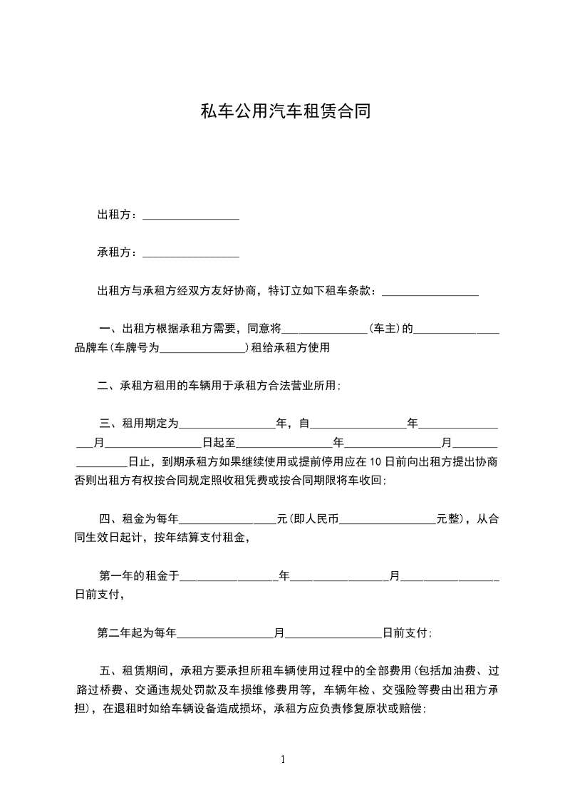 二、租车费用:每月____元整,同时,车辆使用发生的汽油费、停车费、过路过桥费、洗车费、维修费等车辆发生的一切费用由甲方承担。