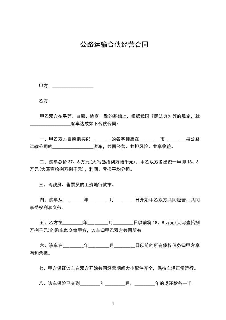 甲乙双方在平等、自愿、协商一致的基础上,根据我国《民法典》等的规定,就__________________客车达成如下合伙合同: