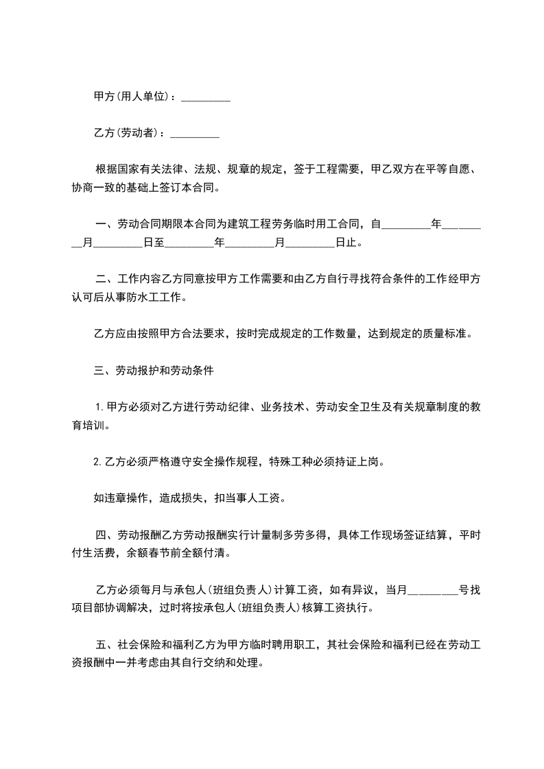 一、劳动合同期限本合同为建筑工程劳务临时用工合同,自_________年_________月_________日至_________年_________月_________日止。