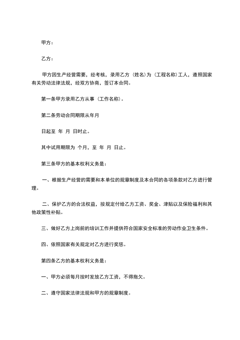 甲方因生产经营需要,经考核,录用乙方 (姓名)为 (工程名称)工人,遵照国家有关劳动法律法规,经双方协商,签订本合同。