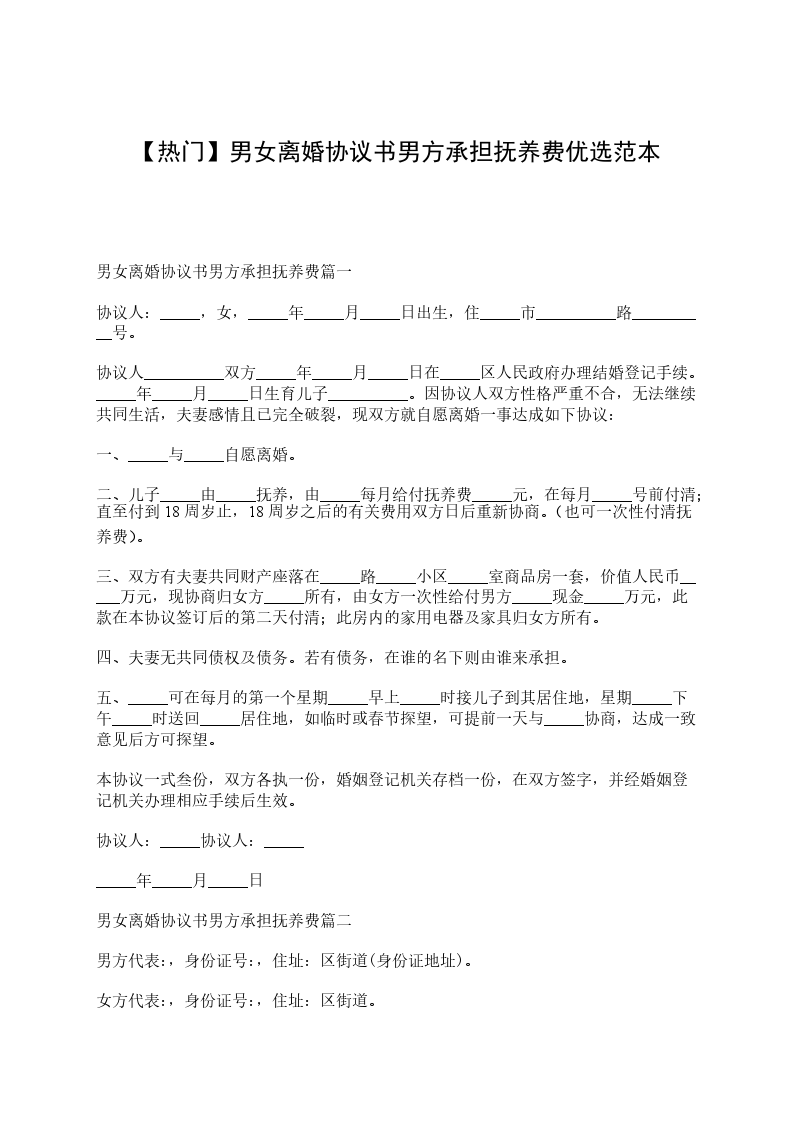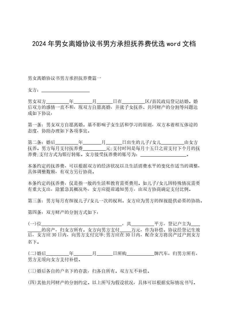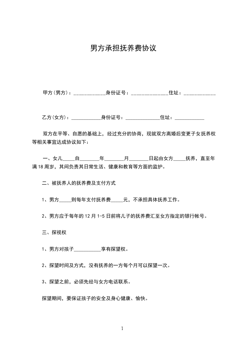 抚养费由男方负责,男方应于每月1-3日期间将抚养费______元通过以下方式支付给女方指定账户,女方暂定账户为是,开户行:______,账号:______。