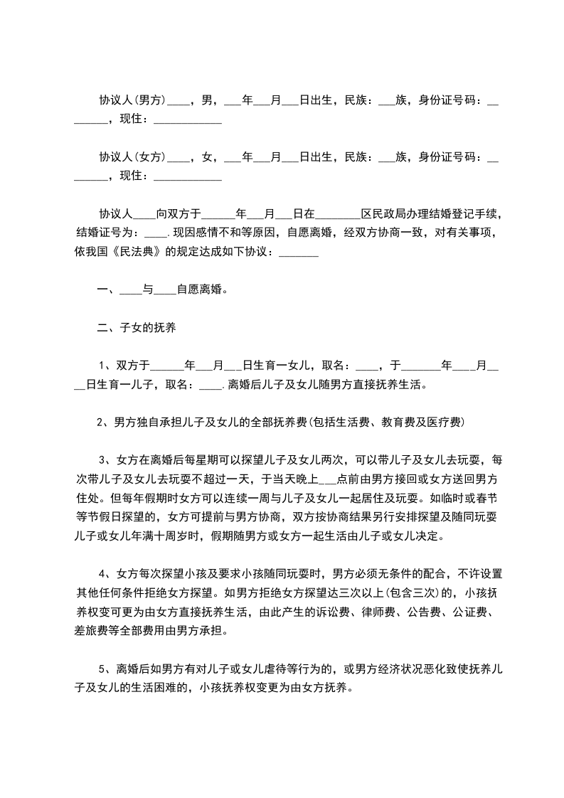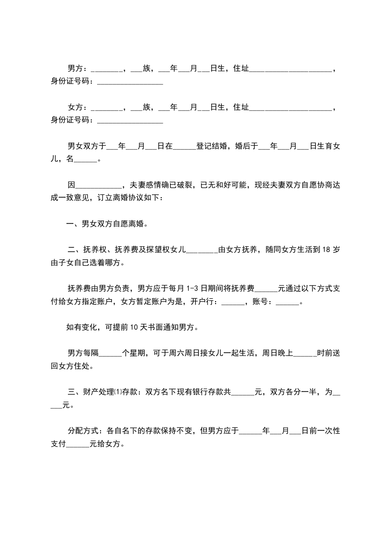 二、抚养权、抚养费及探望权女儿________由女方抚养,随同女方生活到18岁由子女自己选着哪方。