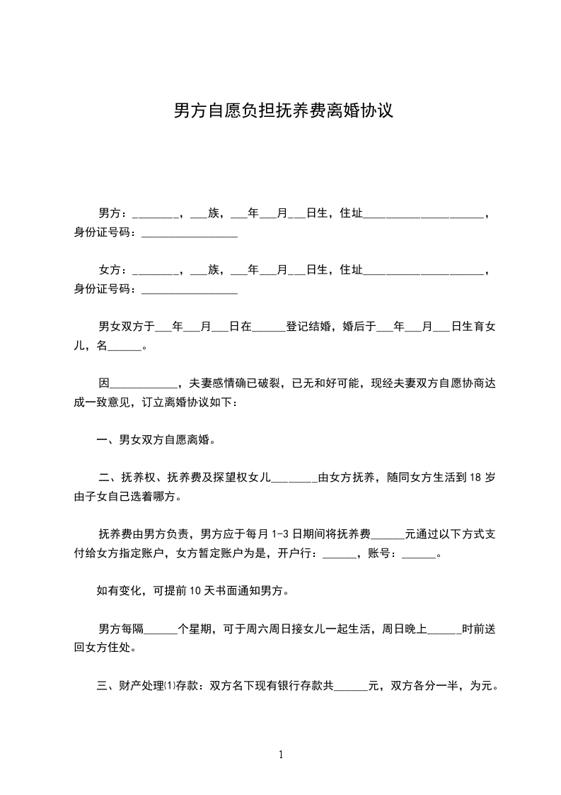一、男女双方婚生女_____由男方抚养,女方每月_____日前支付共计____元人民币抚养费。