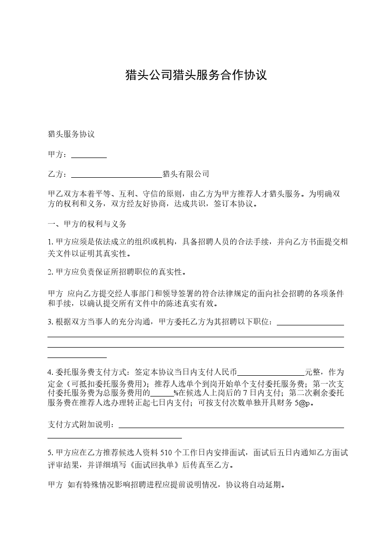 甲方因业务发展需要,委托乙方搜索所需人才。经双方友好协商,达成以下合作条款: