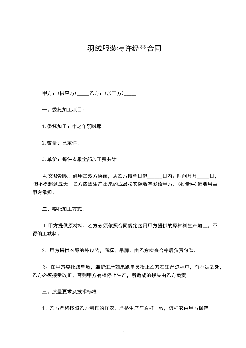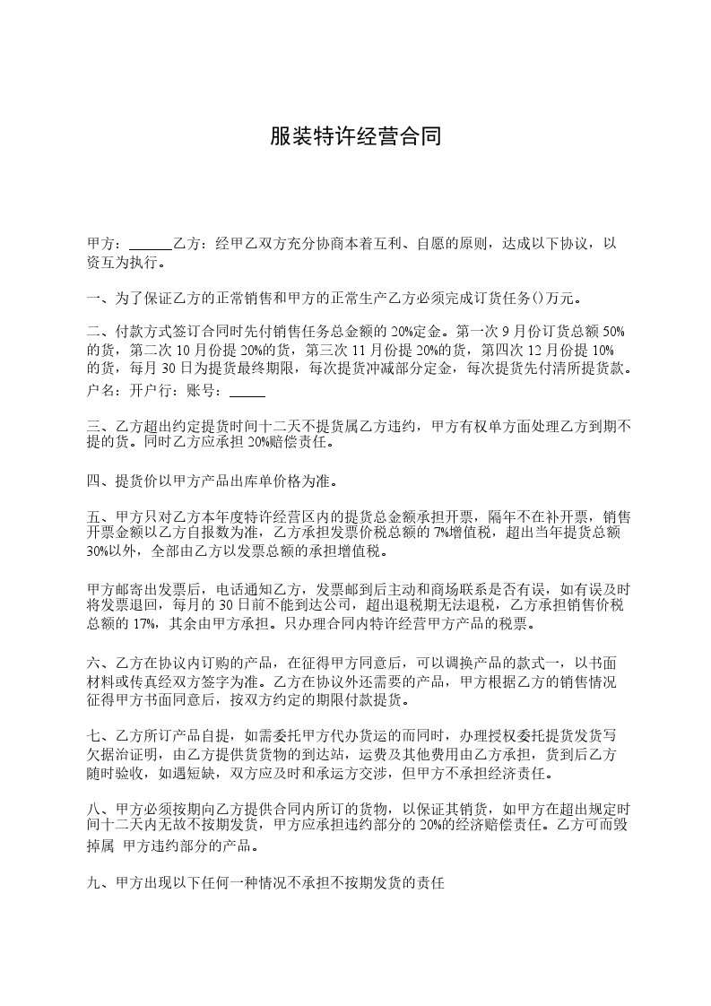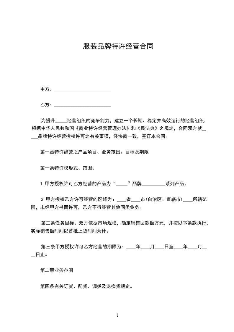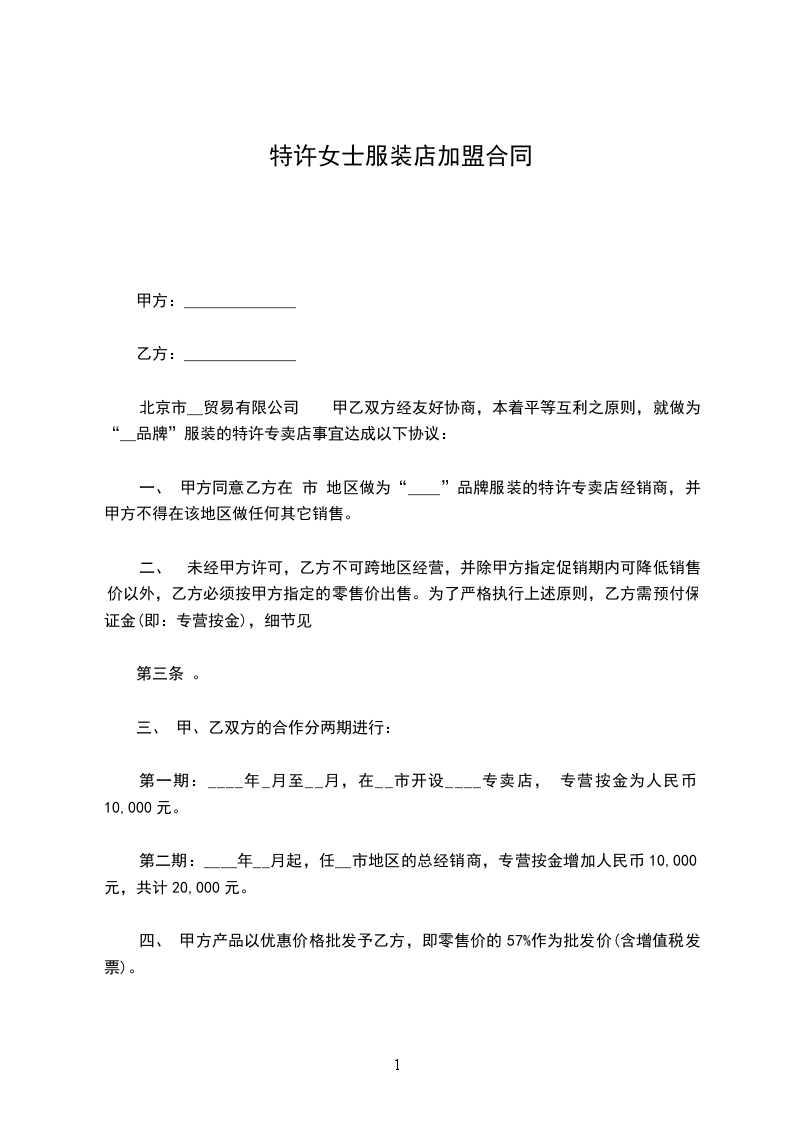 一. 甲方同意乙方在 市 地区做为“_____”品牌服装的特许专卖店经销商,并甲方不得在该地区做任何其它销售。
