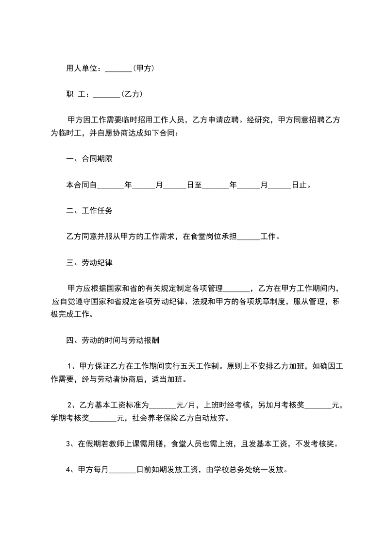 2、甲方没有国家下达职工指标,乙方不享受国家、学校其他一切福利待遇(如:劳保、人保等);