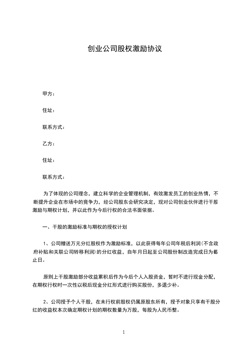 1、公司赠送万元分红股权作为激励标准,以此获得每年公司年税后利润(不含政府补贴和关联公司转移利润)的分红收益,自_____年_____月_____日起至公司股份制改造完成日为截止日。