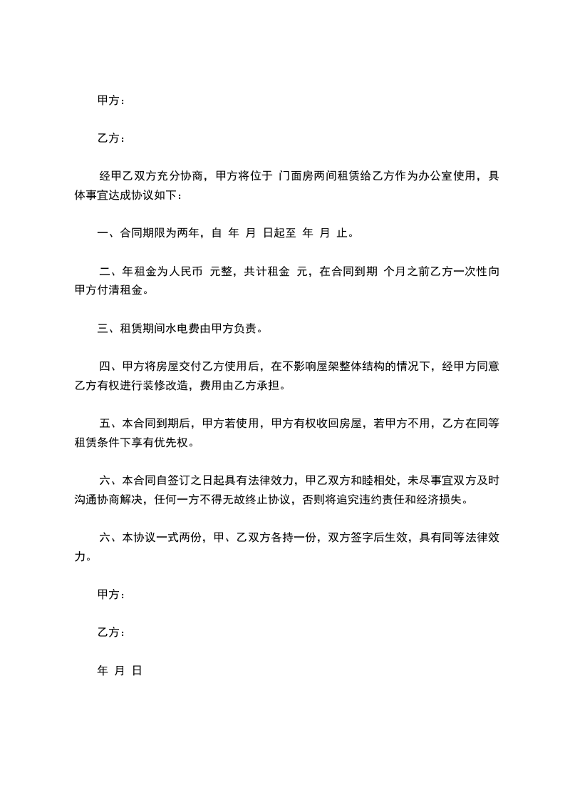 经甲乙双方充分协商,甲方将位于 门面房两间租赁给乙方作为办公室使用,具体事宜达成协议如下: