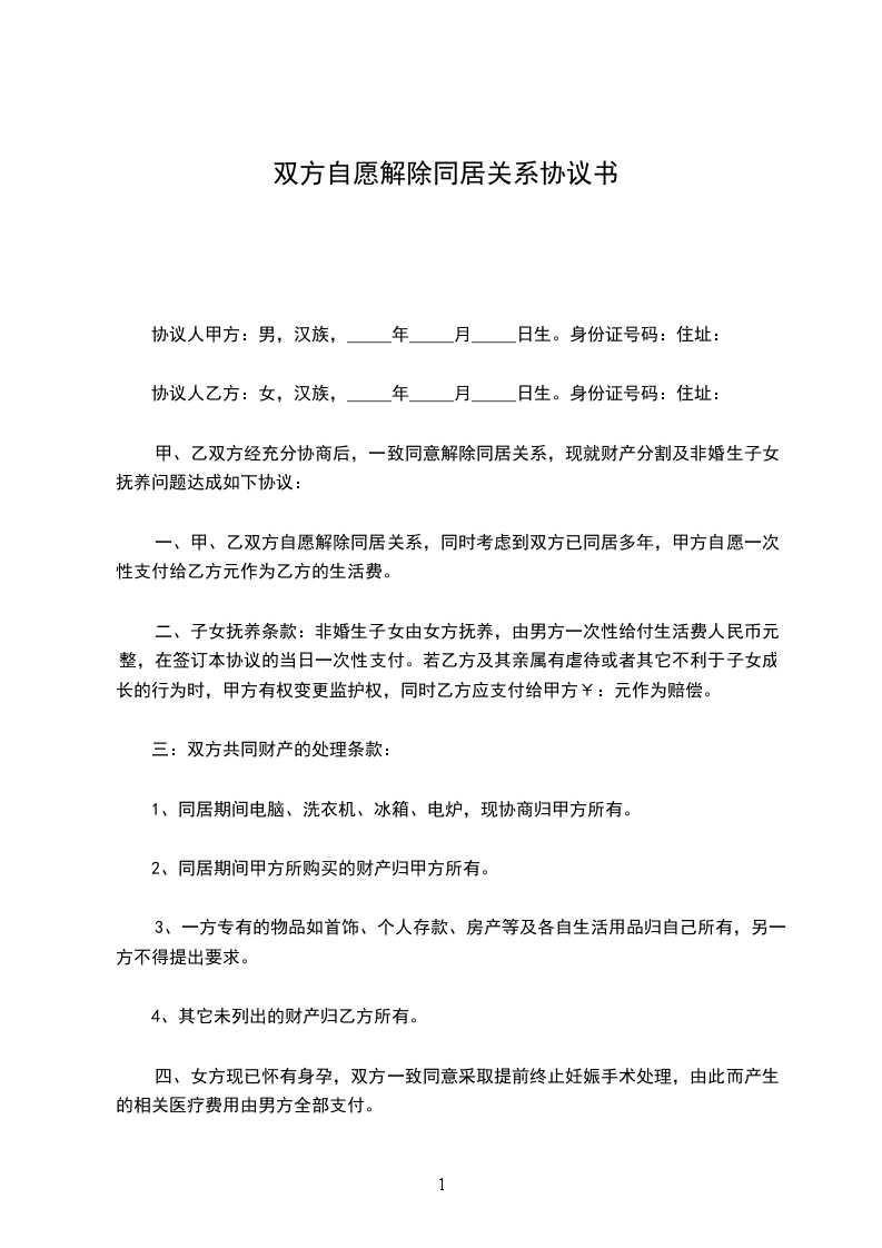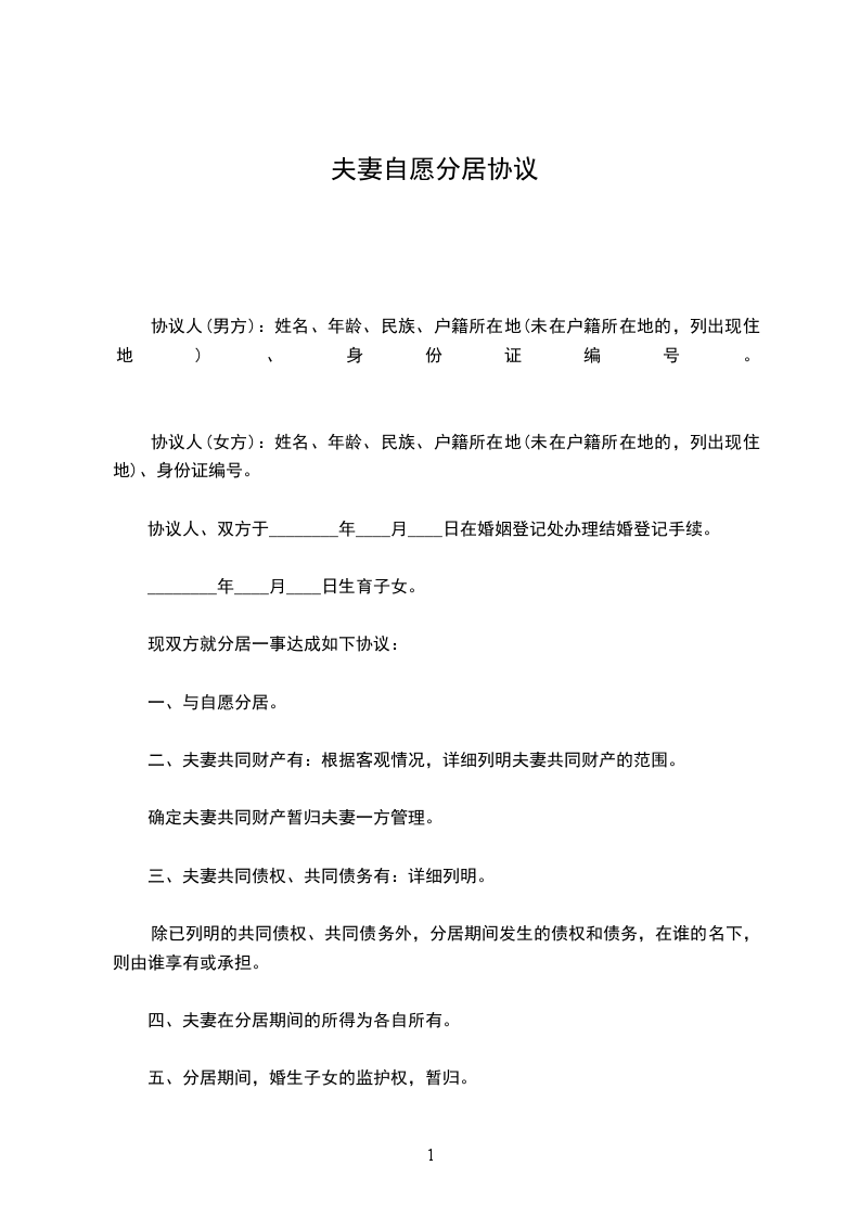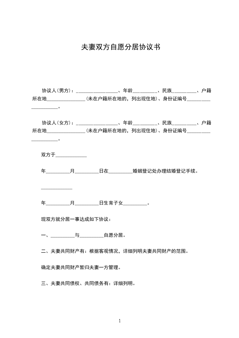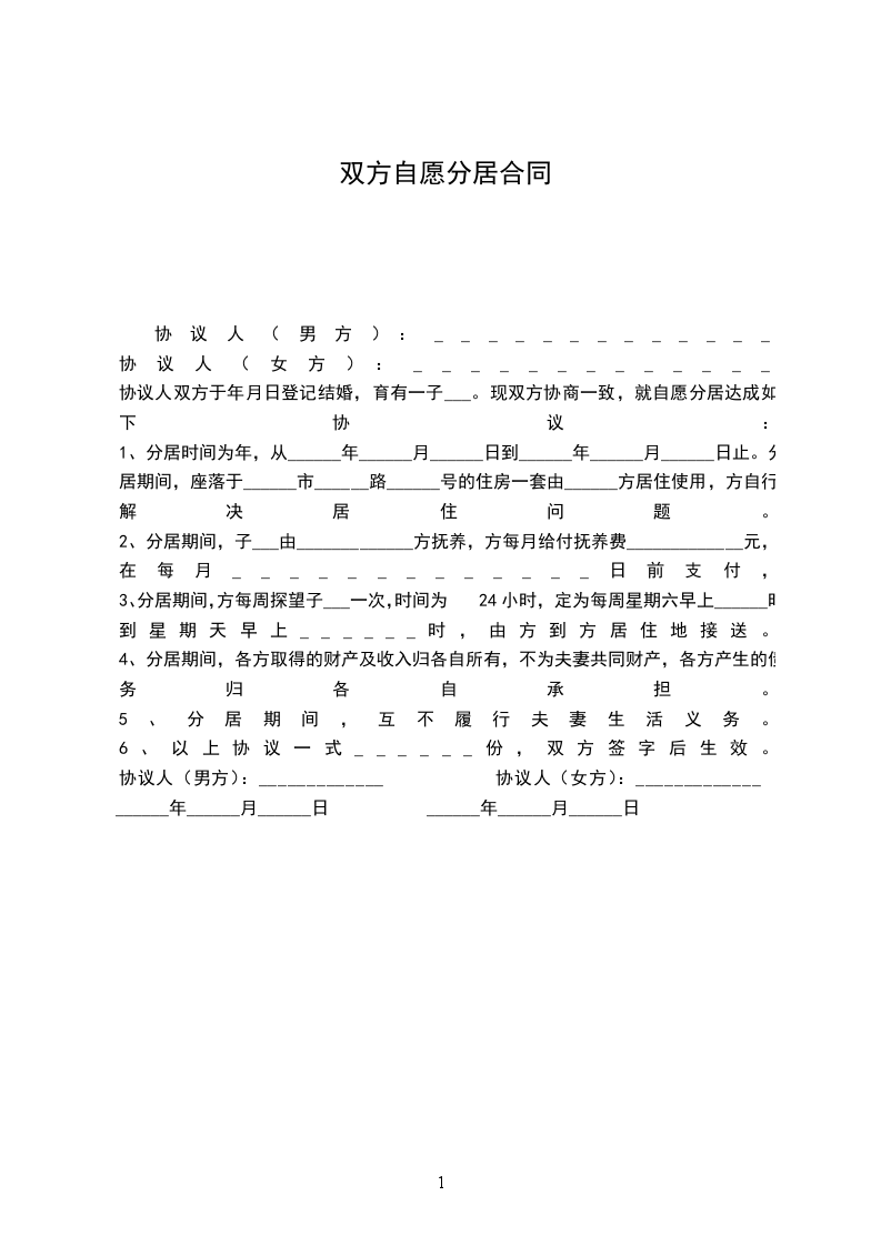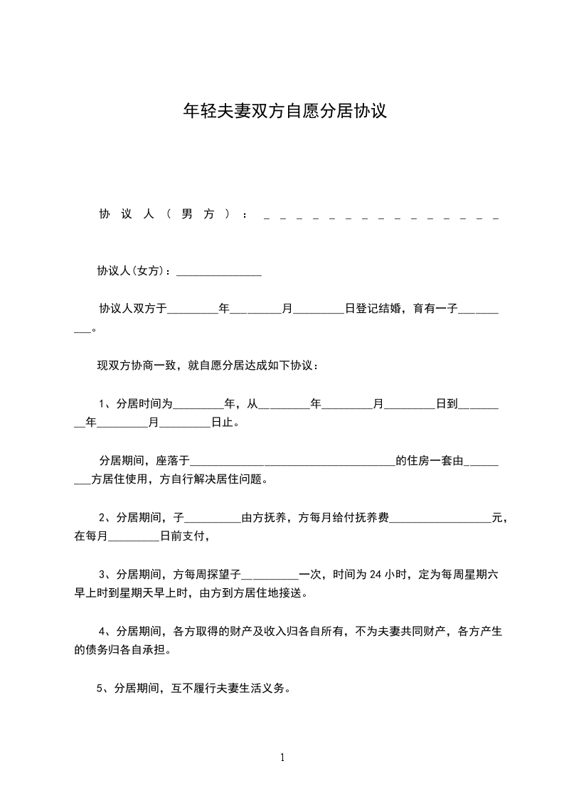 协议人双方于_____年_____月_____日登记结婚,育有一子___。现双方协商一致,就自愿分居达成如下协议: