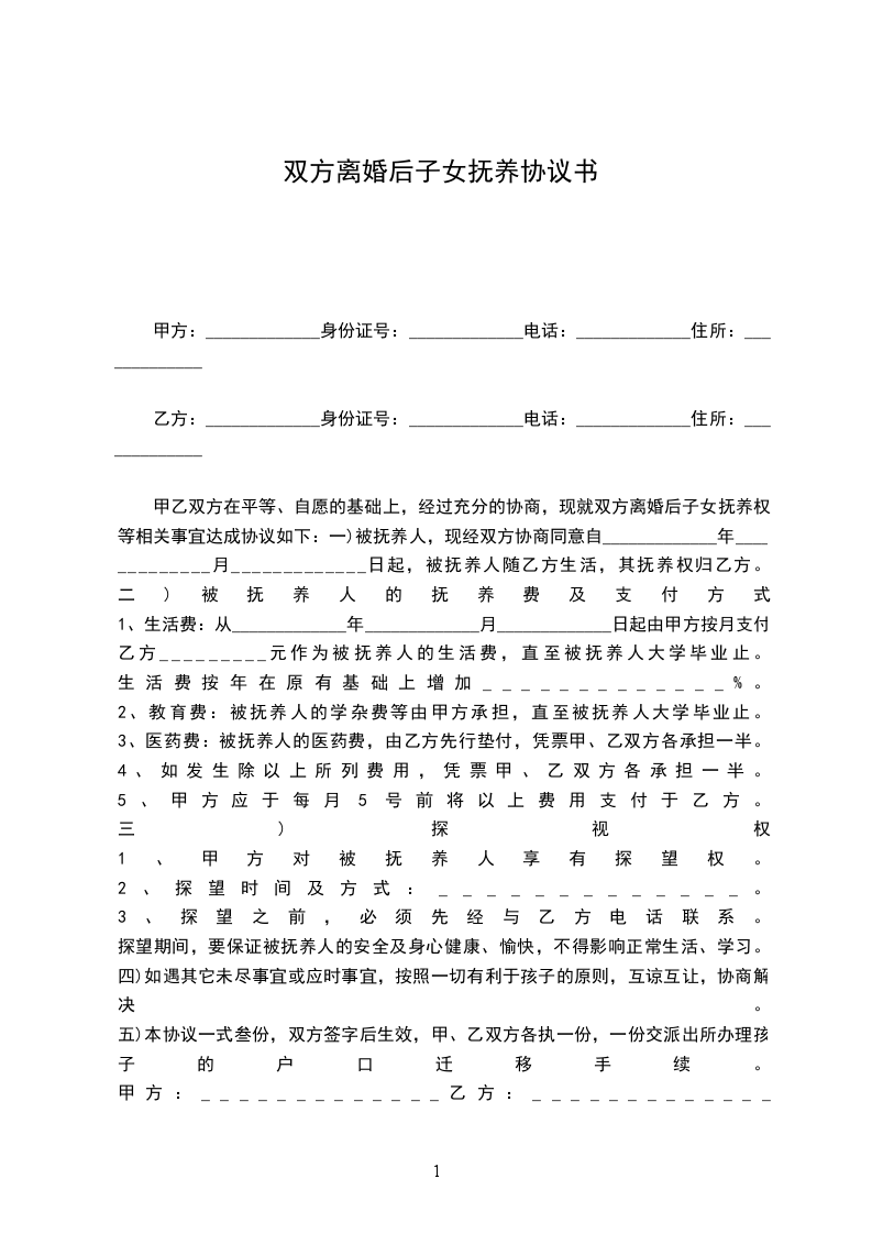五)本协议一式叁份,双方签字后生效,甲、乙双方各执一份,一份交派出所办理孩子的户口迁移手续。