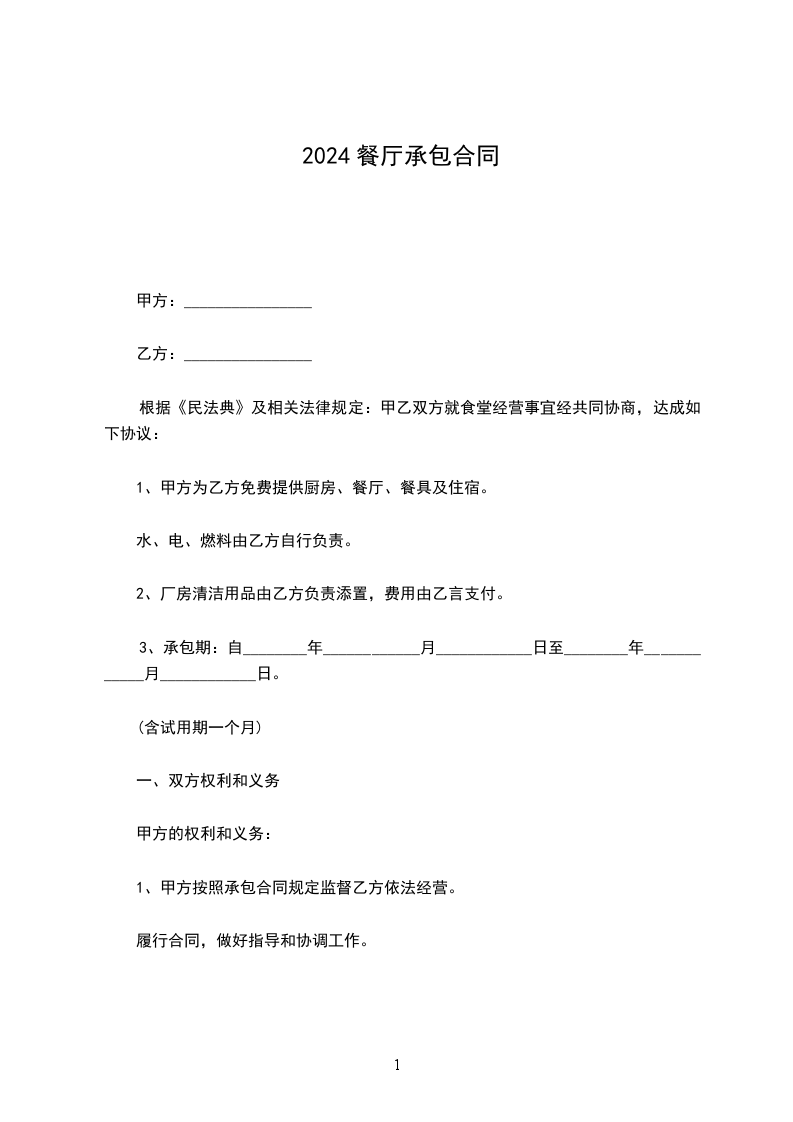 1、甲方为乙方免费提供厨房、餐厅、餐具及住宿。