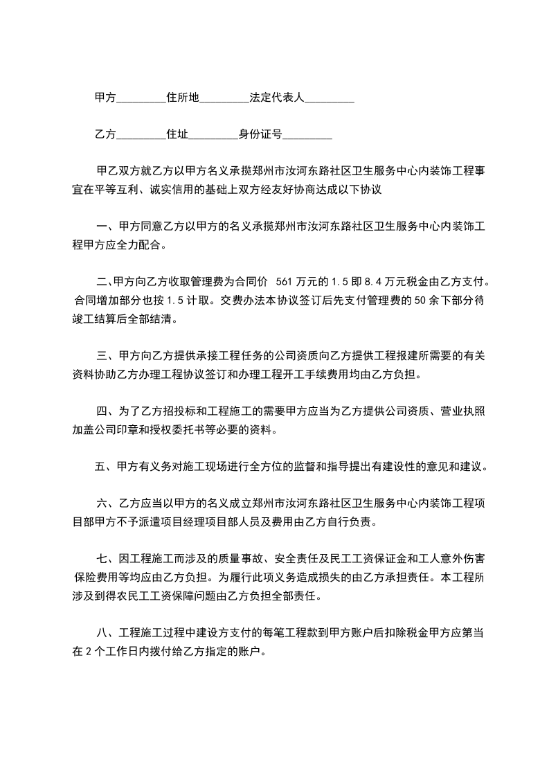 四、甲方向乙方提供承接工程任务的公司资质,向乙方提供工程报建所需要的有关资料,协助乙方办理工程协议签订和办理工程开发,凡须由施工单位负责交缴的费用和资料等有关费用均由乙方负责。甲方同时协助乙方办理收付工程款和协助协调与工程管理部门以及建设方的关系。