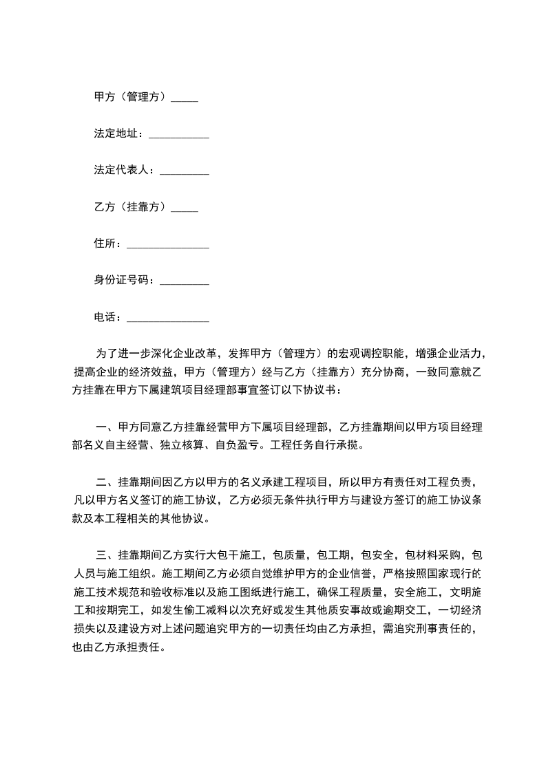 为了进一步深化企业改革,发挥甲方(管理方)的宏观调控职能,增强企业活力,提高企业的经济效益,甲方(管理方)经与乙方(挂靠方)充分协商,一致同意就乙方挂靠在甲方下属建筑项目经理部事宜签订以下协议书: