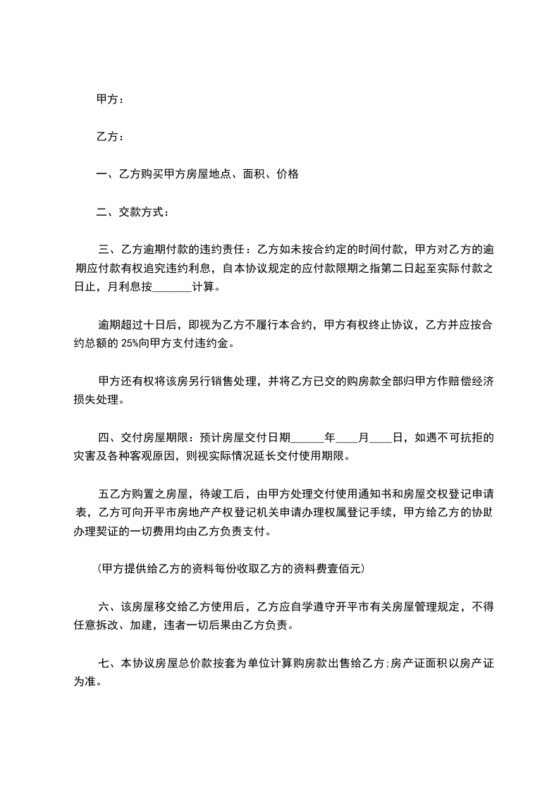 五乙方购置之房屋,待竣工后,由甲方处理交付使用通知书和房屋交权登记申请表,乙方可向开平市房地产产权登记机关申请办理权属登记手续,甲方给乙方的协助办理契证的一切费用均由乙方负责支付。