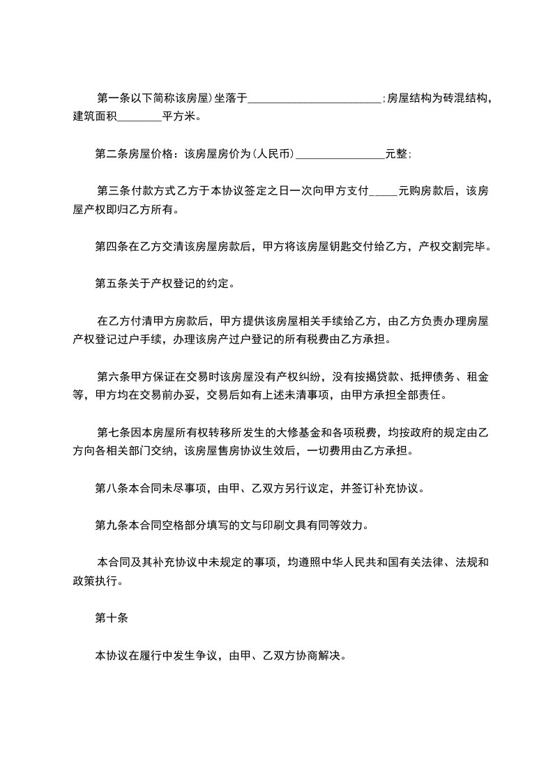 第三条付款方式乙方于本协议签定之日一次向甲方支付_____元购房款后,该房屋产权即归乙方所有。