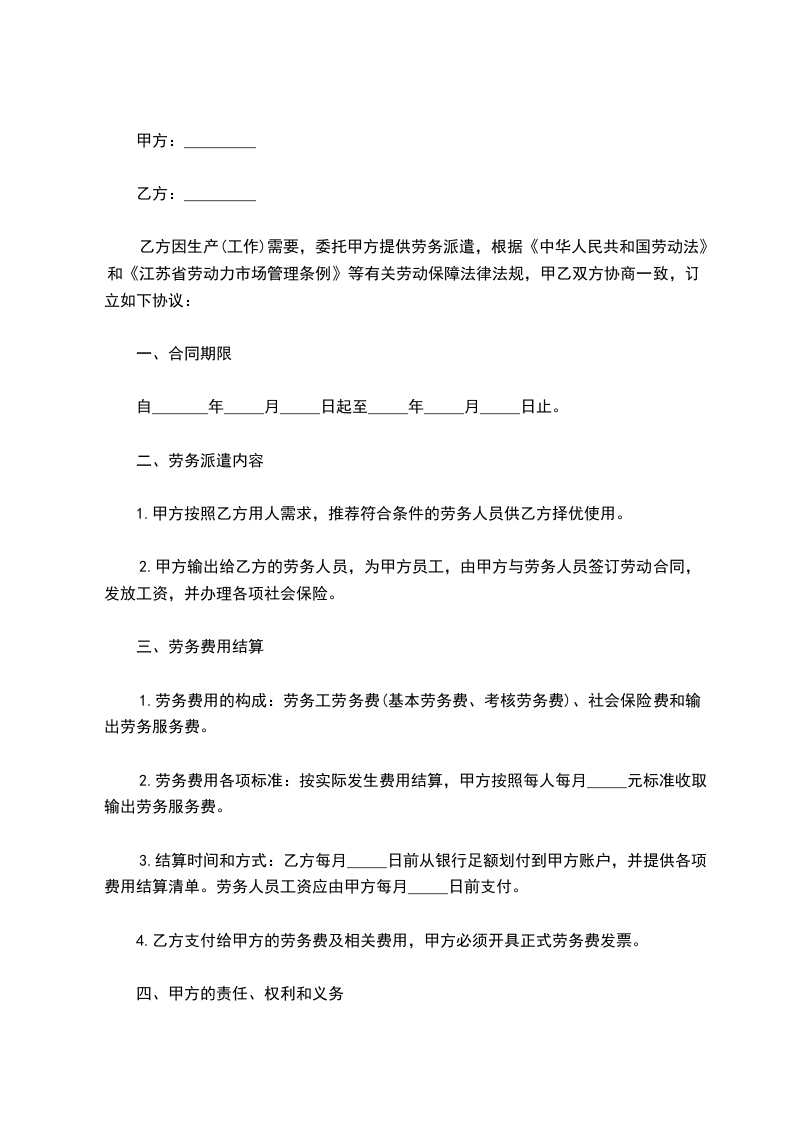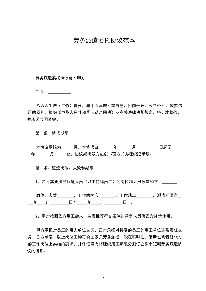 乙方因生产(工作)需要,委托甲方提供劳务派遣,根据《中华人民共和国劳动法》和《____省劳动力市场管理条例》等有关劳动保障法律法规,甲乙双方协商一致,订立如下协议:
