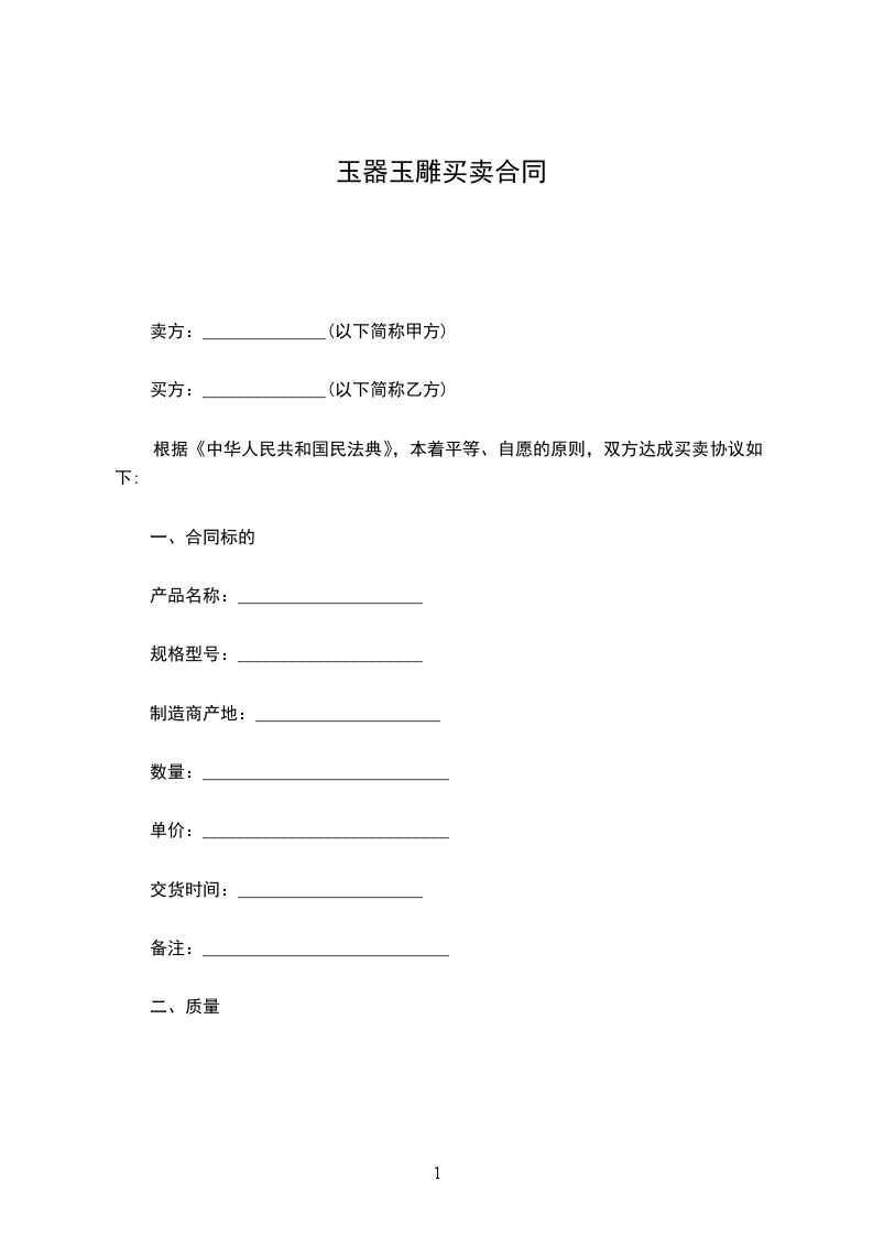 一、品名、数量及规格乙方在甲方商行________年________月________日买玉雕工艺商品(小平安牌(吉祥件)________件。
