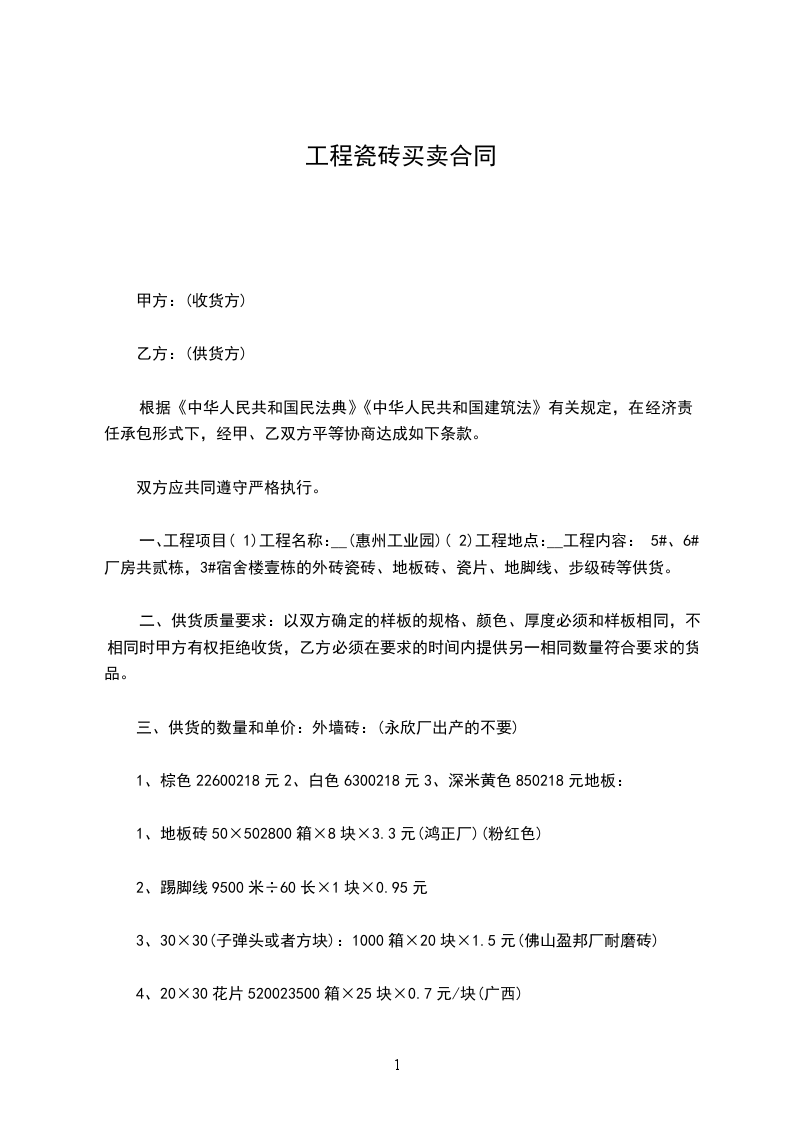 一、工程项目(1)工程名称:__(惠州工业园)(2)工程地点:__工程内容:5#、6#厂房共贰栋,3#宿舍楼壹栋的外砖瓷砖、地板砖、瓷片、地脚线、步级砖等供货。