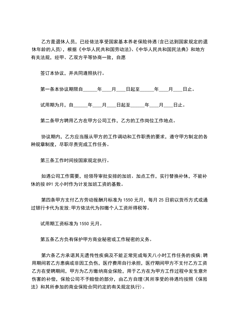 乙方是退休人员,已经依法享受国家基本养老保险待遇(含已达到国家规定的退休年龄的人员),根据《中华人民共和国劳动法》、《中华人民共和国民法典》和地方有关法规,经甲、乙双方平等协商一致,自愿
