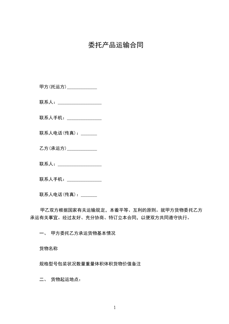 一、 甲方委托乙方承运货物基本情况
