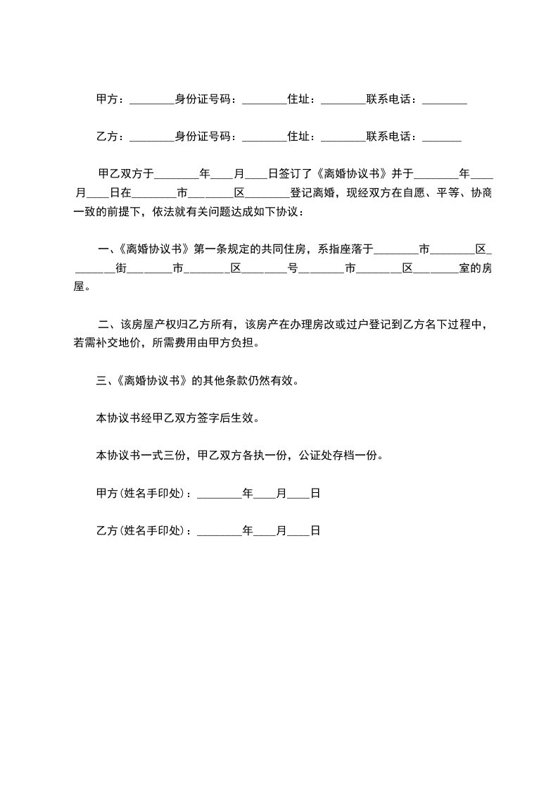 一、《离婚协议书》第一条规定的共同住房,系指座落于________市________区________街________市________区________号________市________区________室的房屋。