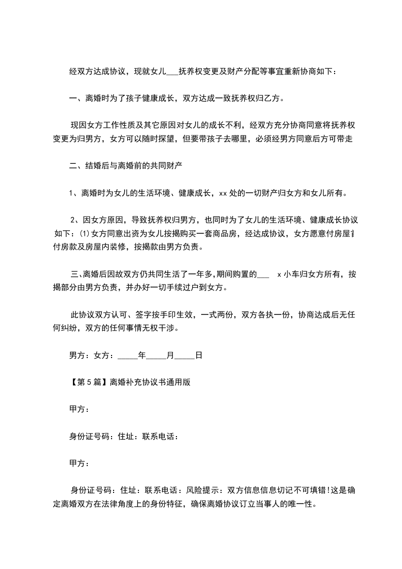 甲乙双方于________年____月____日签订了《离婚协议书》并于________年____月____日在________市________区________登记离婚,现经双方在自愿、平等、协商一致的前提下,依法就有关问题达成如下协议: