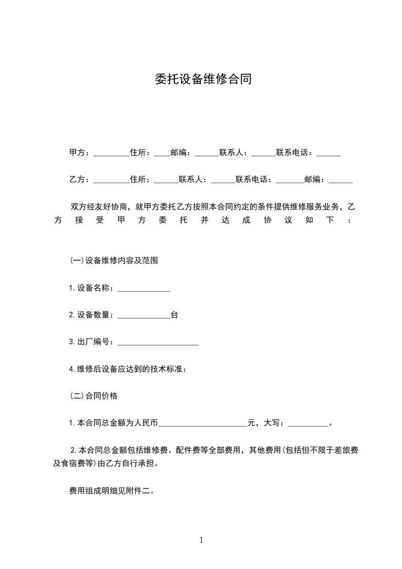 1.乙方逾期维修设备的,每逾期________,向甲方支付合同总金额的_______‰作为违约金,违约金累计不超过合同总金额的_______%。