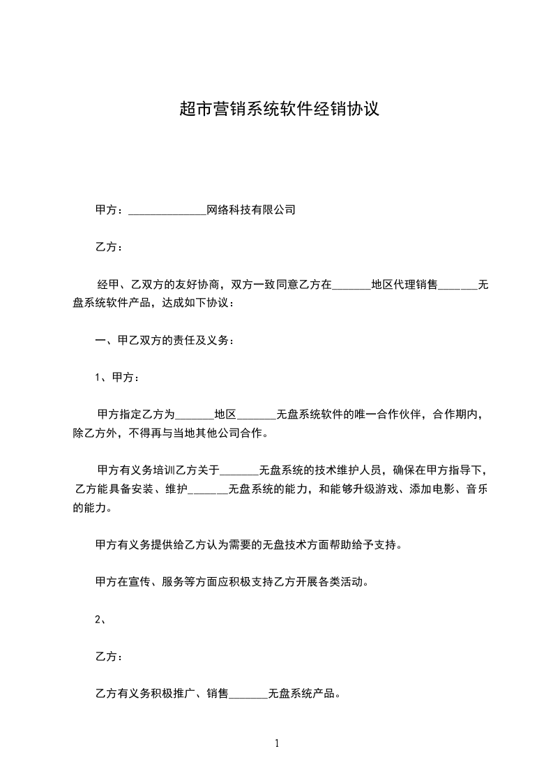经甲、乙双方的友好协商,双方一致同意乙方在_______地区代理销售_______无盘系统软件产品,达成如下协议:
