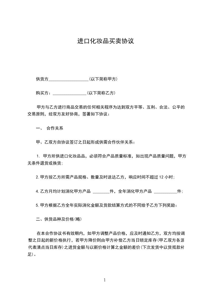 1. 甲方所供进口化妆品品,必须符合产品质量标准,如出现产品质量问题,甲方无条件退货或换货;