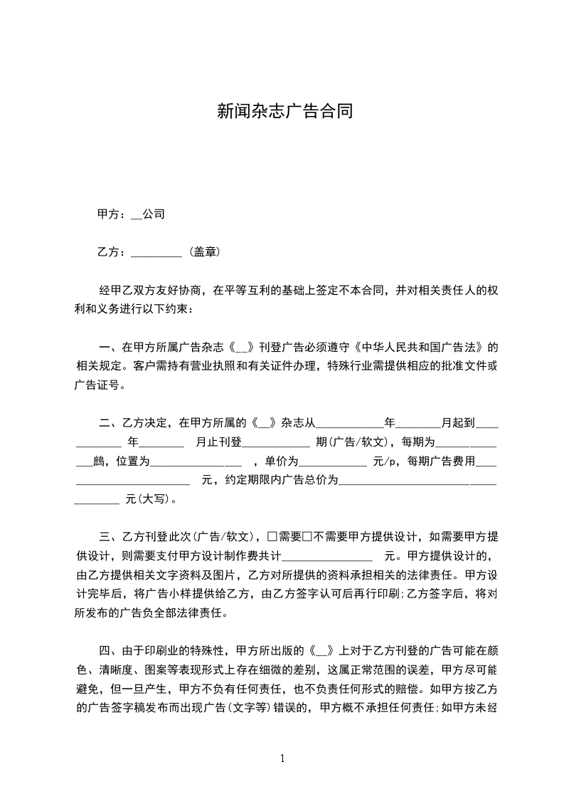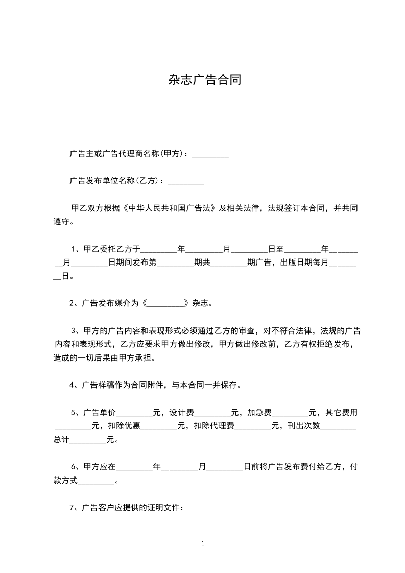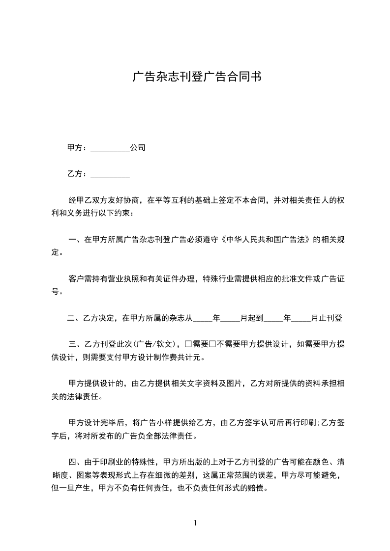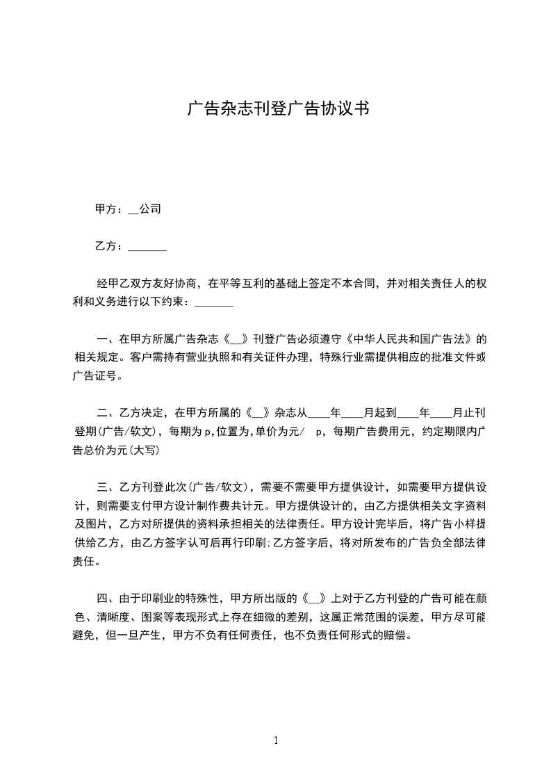 1、甲乙委托乙方于_________年_________月_________日至_________年_________月_________日期间发布第_________期共_________期广告,出版日期每月_________日。