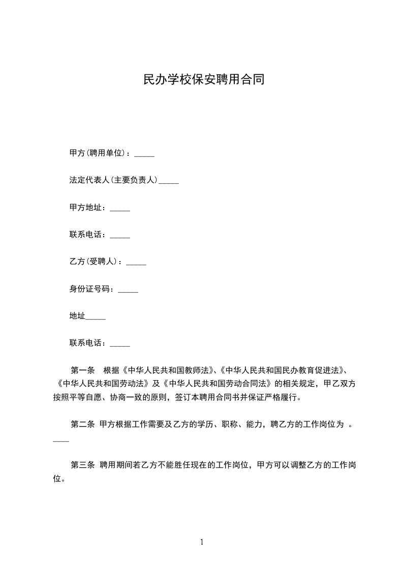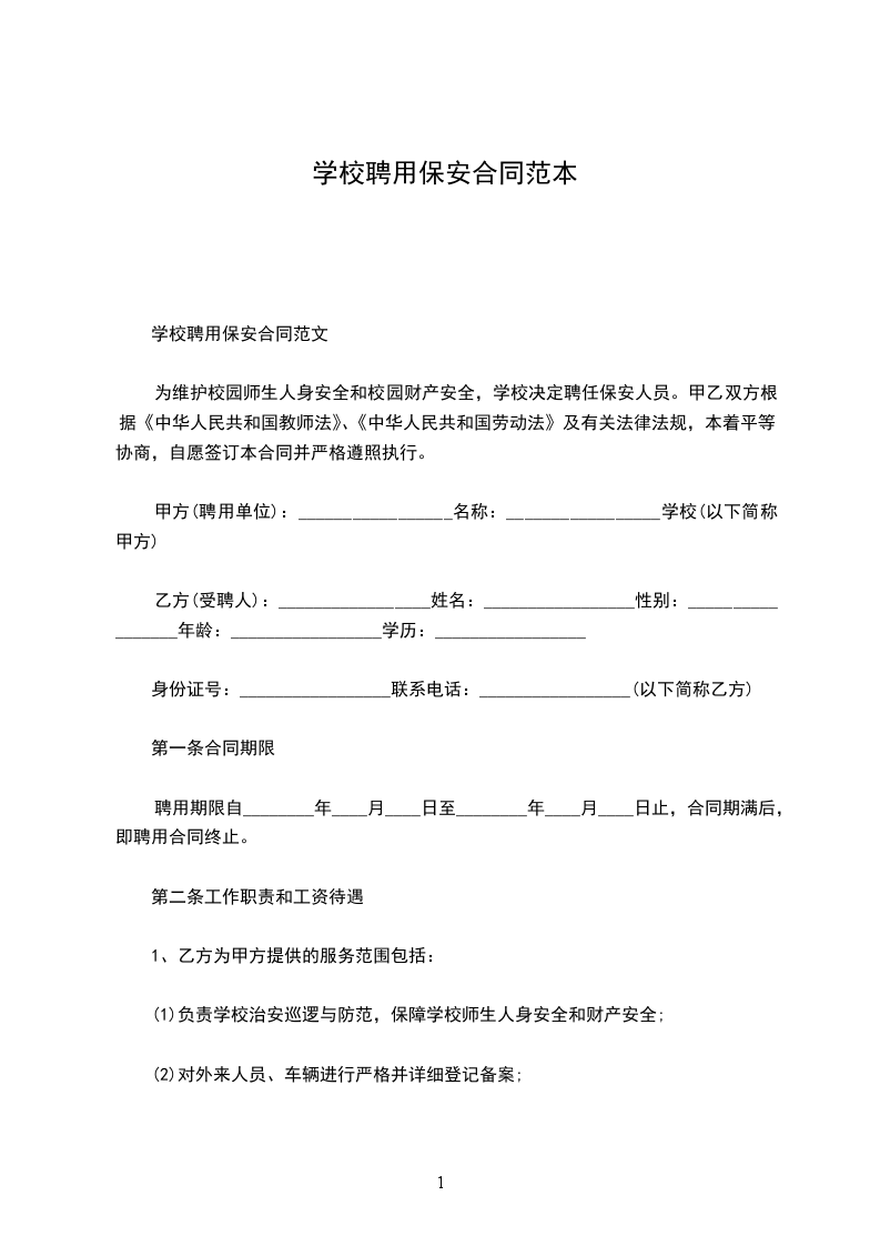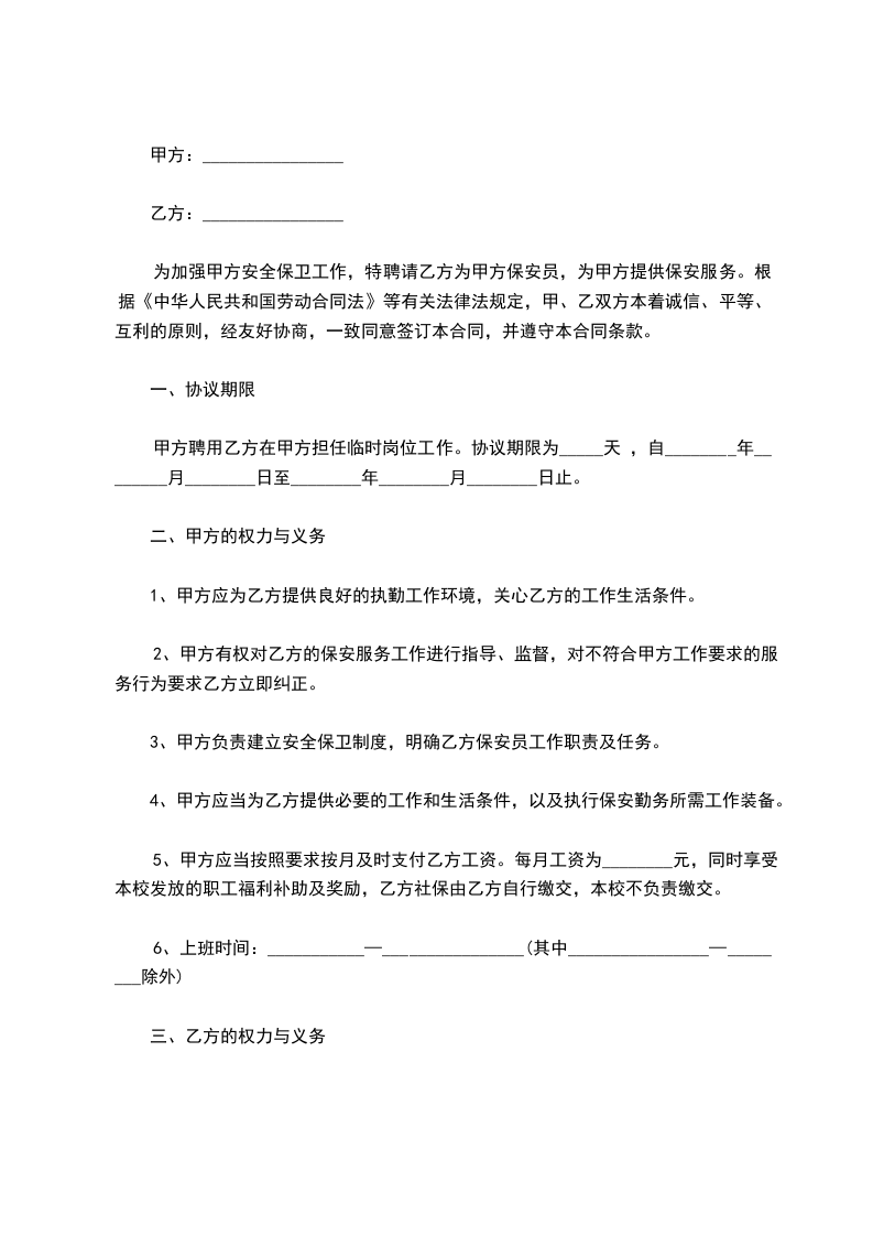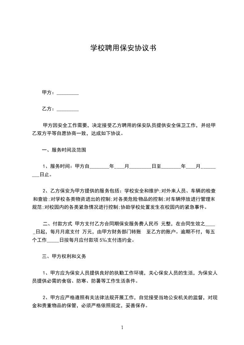 为加强学校的安全管理,维护正常的教学工作和生活秩序,确保全校师生的人身财产安全,控制校园安全事故和治安案件的发生,乙方向甲方提供保安服务,为维护甲、乙双方的权利,经双方协商,特签定以下协议。