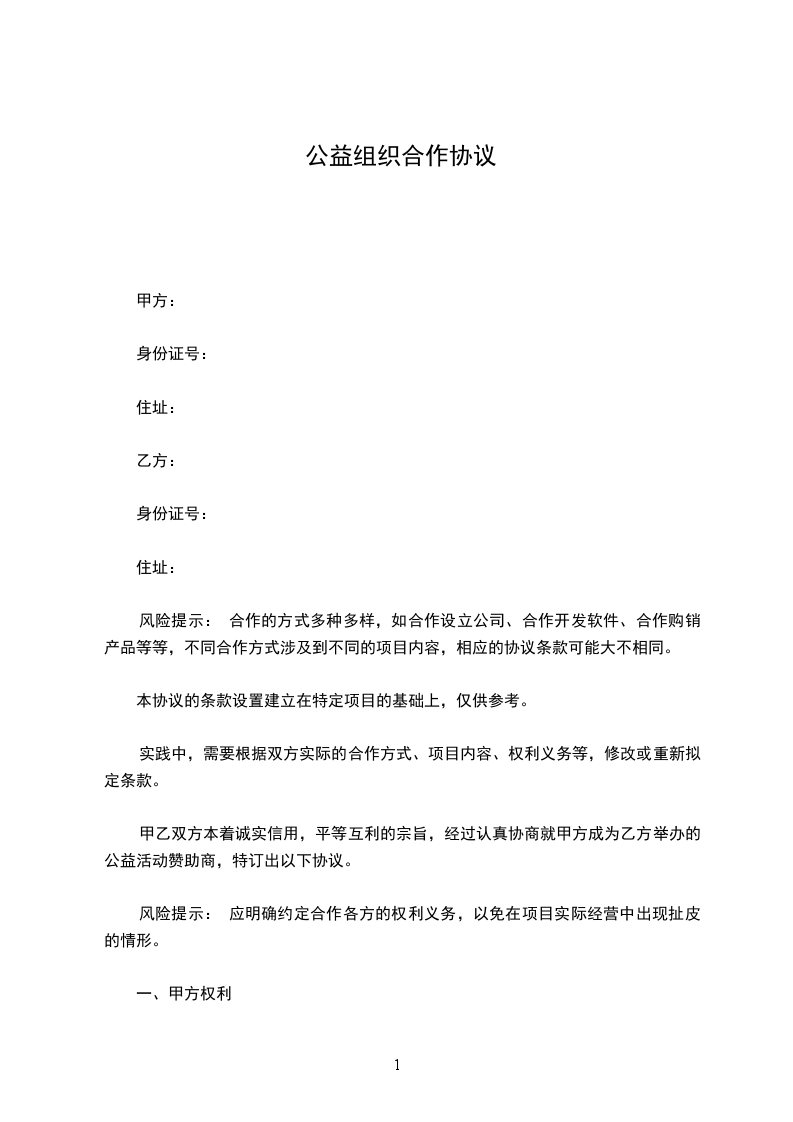 风险提示: 合作的方式多种多样,如合作设立公司、合作开发软件、合作购销产品等等,不同合作方式涉及到不同的项目内容,相应的协议条款可能大不相同。