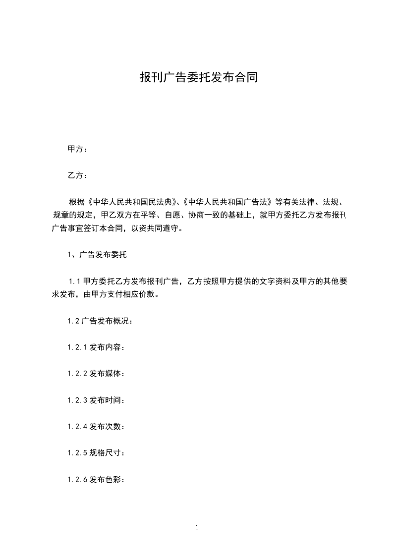 根据《中华人民共和国民法典》、《中华人民共和国广告法》等有关法律、法规、规章的规定,甲乙双方在平等、自愿、协商一致的基础上,就甲方委托乙方发布报刊广告事宜签订本合同,以资共同遵守。