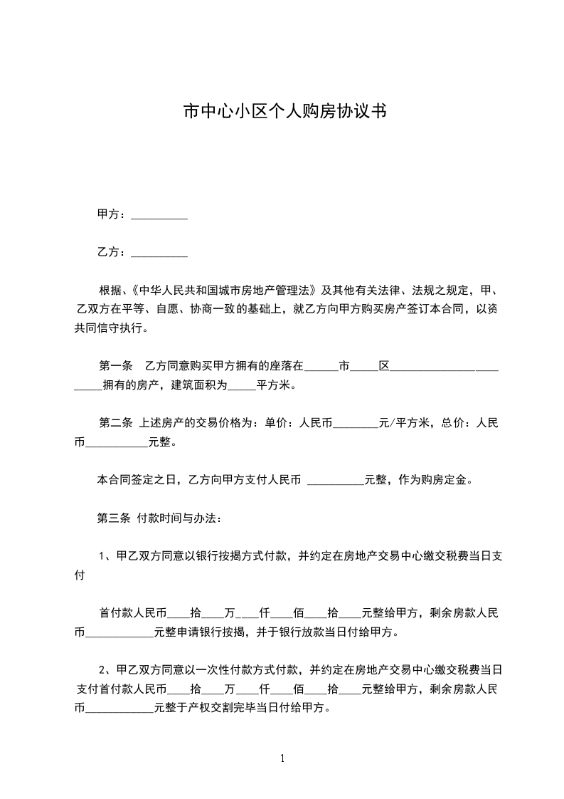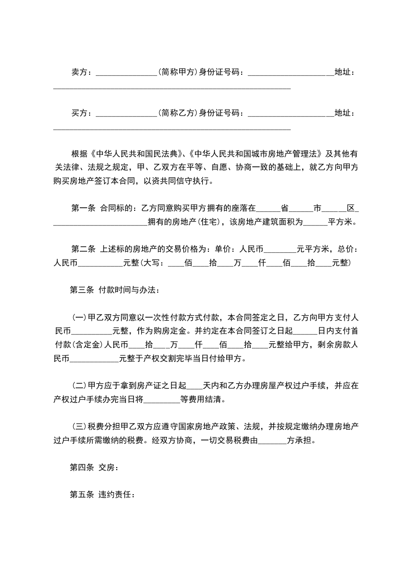 (一)甲乙双方同意以一次性付款方式付款,本合同签定之日,乙方向甲方支付人民币__________元整,作为购房定金。并约定在本合同签订之日起______日内支付首付款(含定金)人民币____拾____万____仟____佰____拾____元整给甲方,剩余房款人民币____________元整于产权交割完毕当日付给甲方。