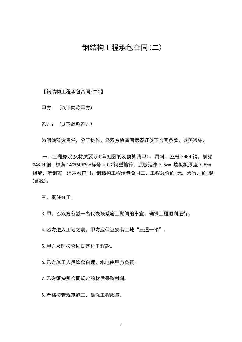 一、工程概况及材质要求(详见图纸及预算清单)。用料:立柱248H钢,横梁248 H钢,檩条140*50*20*标号2.0C钢型镀锌,顶板泡沫7.5cm 墙板板厚度7.5cm,阻燃,塑钢窗,消声卷帘门。钢结构工程承包合同二、工程总价约 元,大写:约 整(含税)。