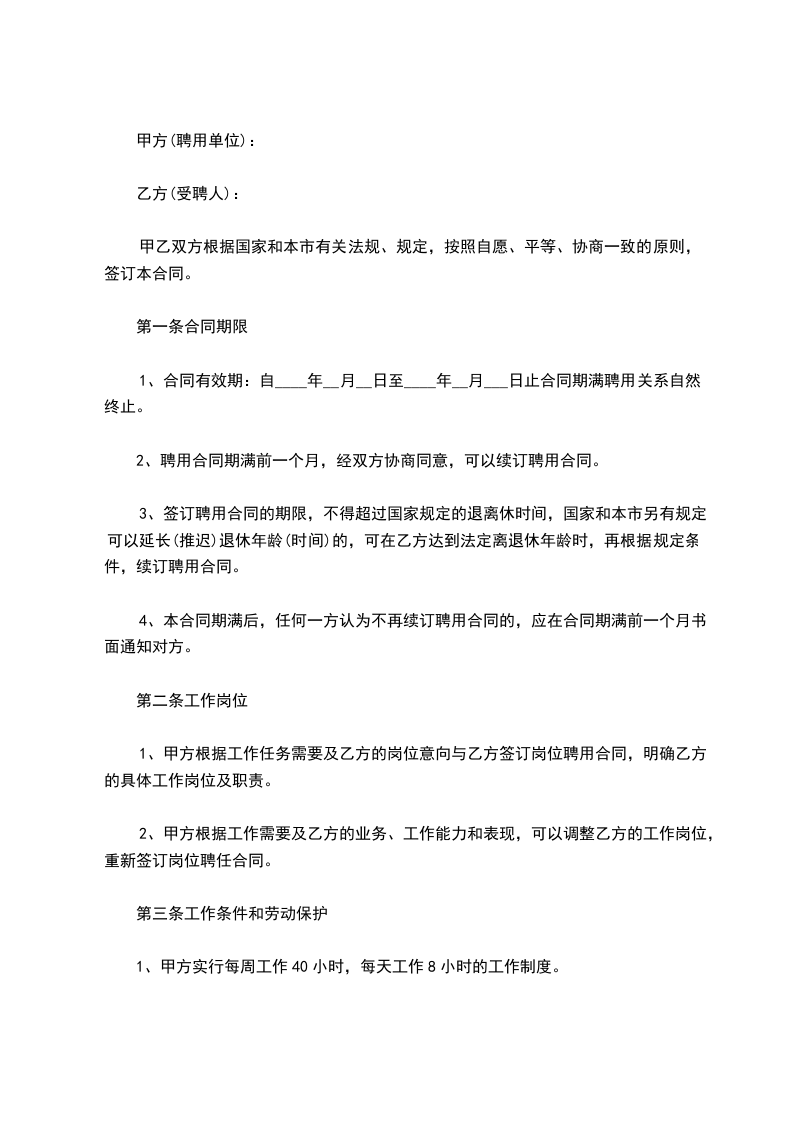 3、签订聘用合同的期限,不得超过国家规定的退离休时间,国家和本市另有规定可以延长(推迟)退休年龄(时间)的,可在乙方达到法定离退休年龄时,再根据规定条件,续订聘用合同。