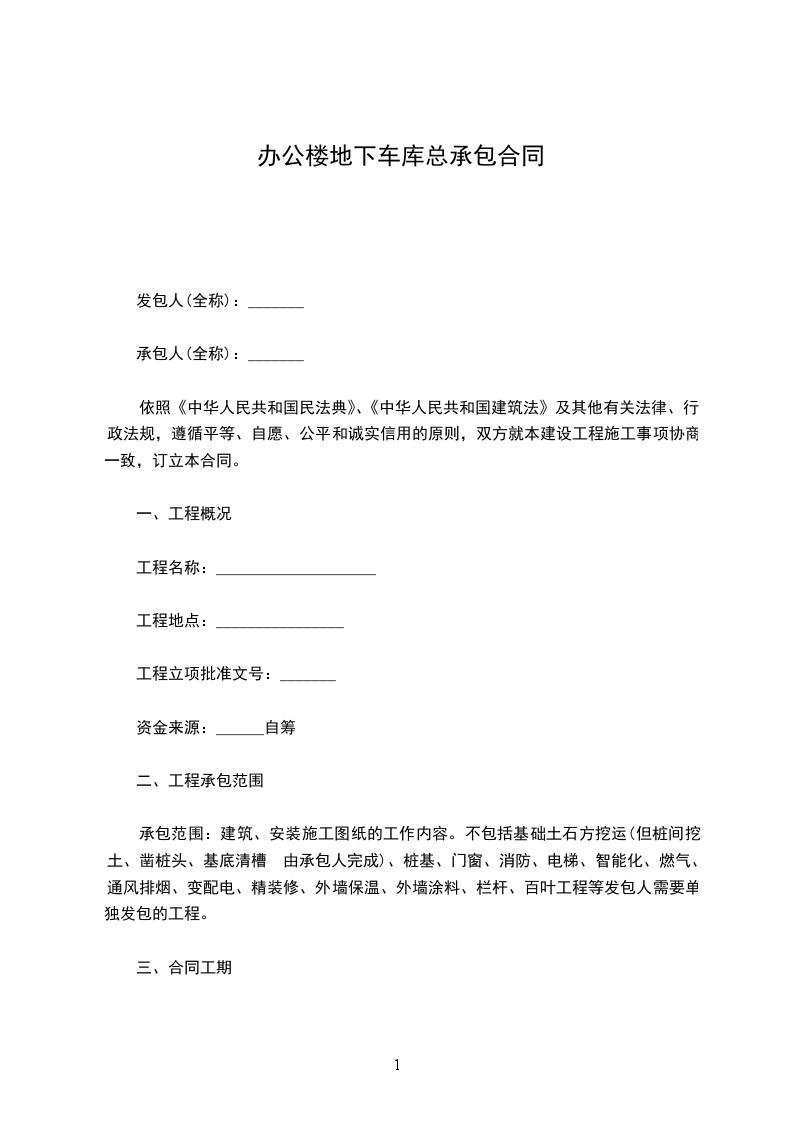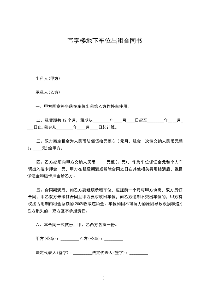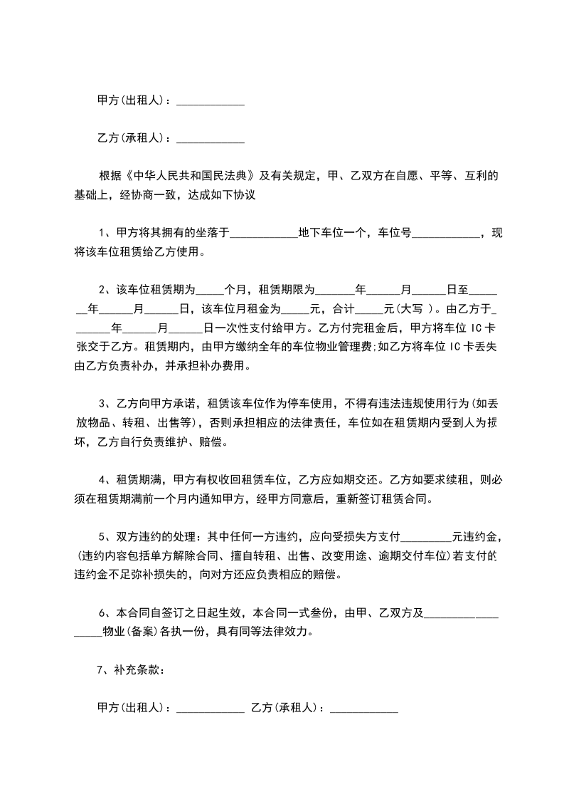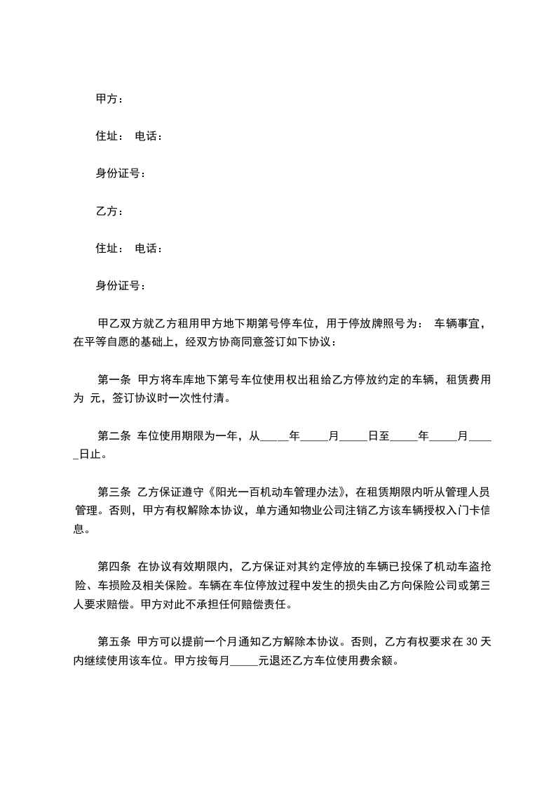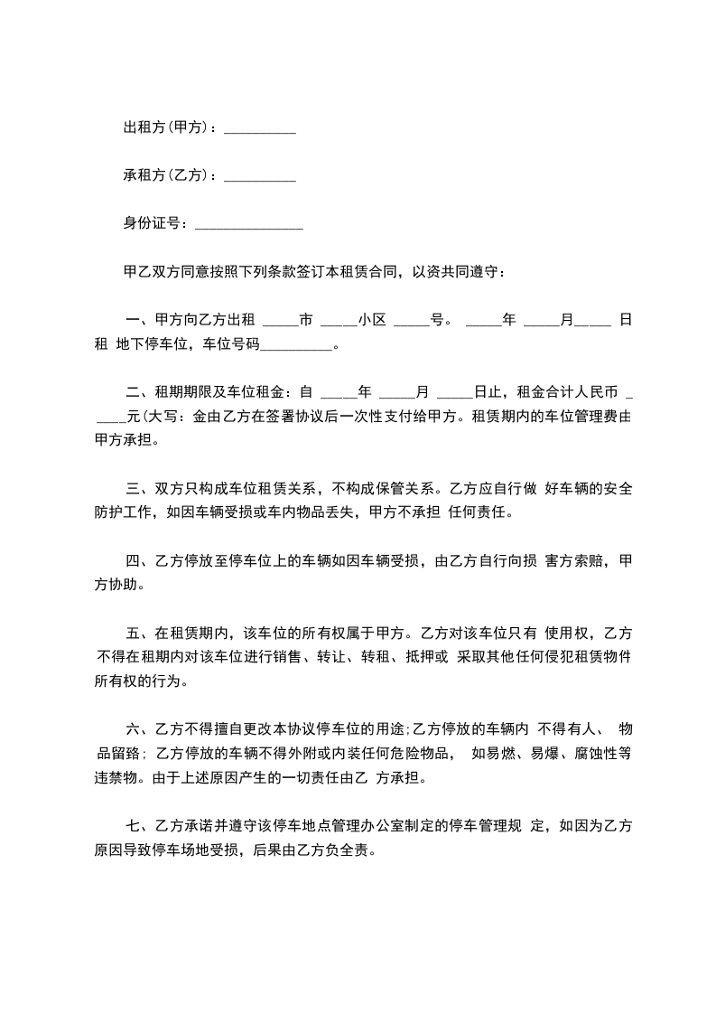 一、甲方向乙方出租 _____市 _____小区 _____号。 _____年 _____月_____ 日租 地下停车位,车位号码__________。