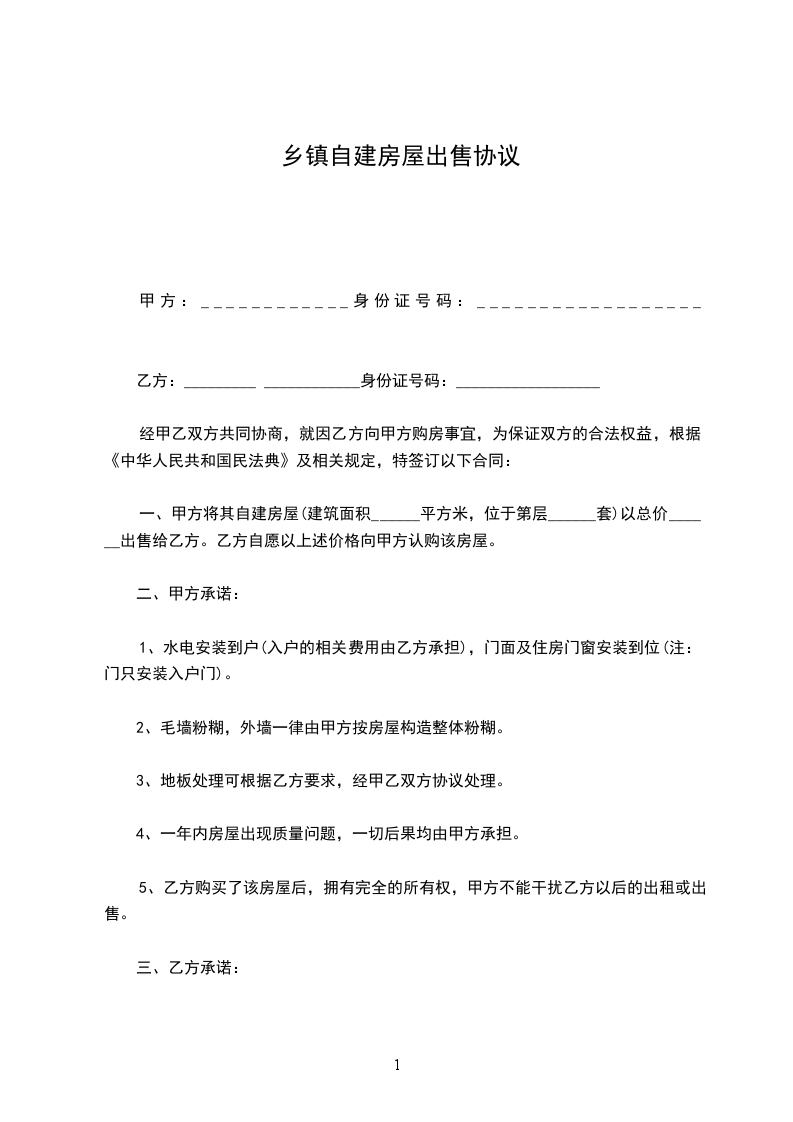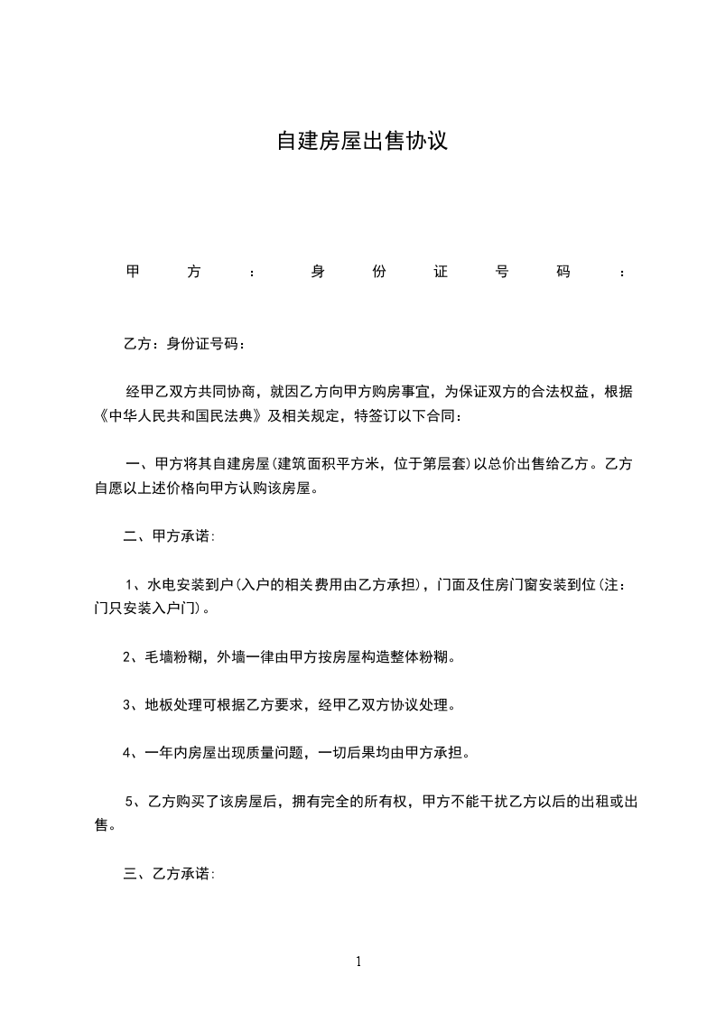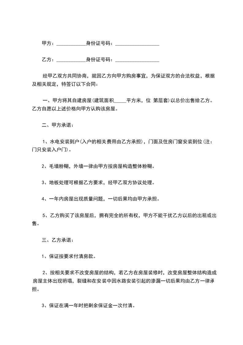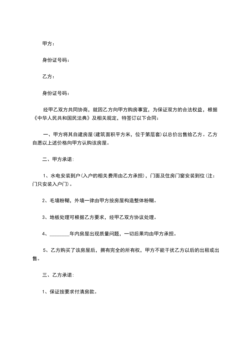一、甲方将其自建房屋(建筑面积平方米,位于第层套)以总价出售给乙方。乙方自愿以上述价格向甲方认购该房屋。