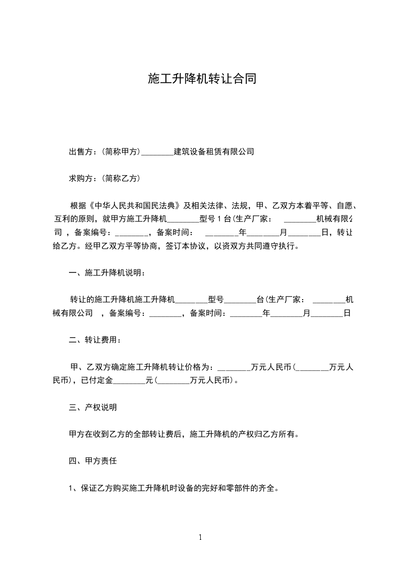 根据《中华人民共和国民法典》及相关法律、法规,甲、乙双方本着平等、自愿、互利的原则,就甲方施工升降机________型号1台(生产厂家: ________机械有限公司 ,备案编号:________,备案时间: ________年________月________日,转让给乙方。经甲乙双方平等协商,签订本协议,以资双方共同遵守执行。