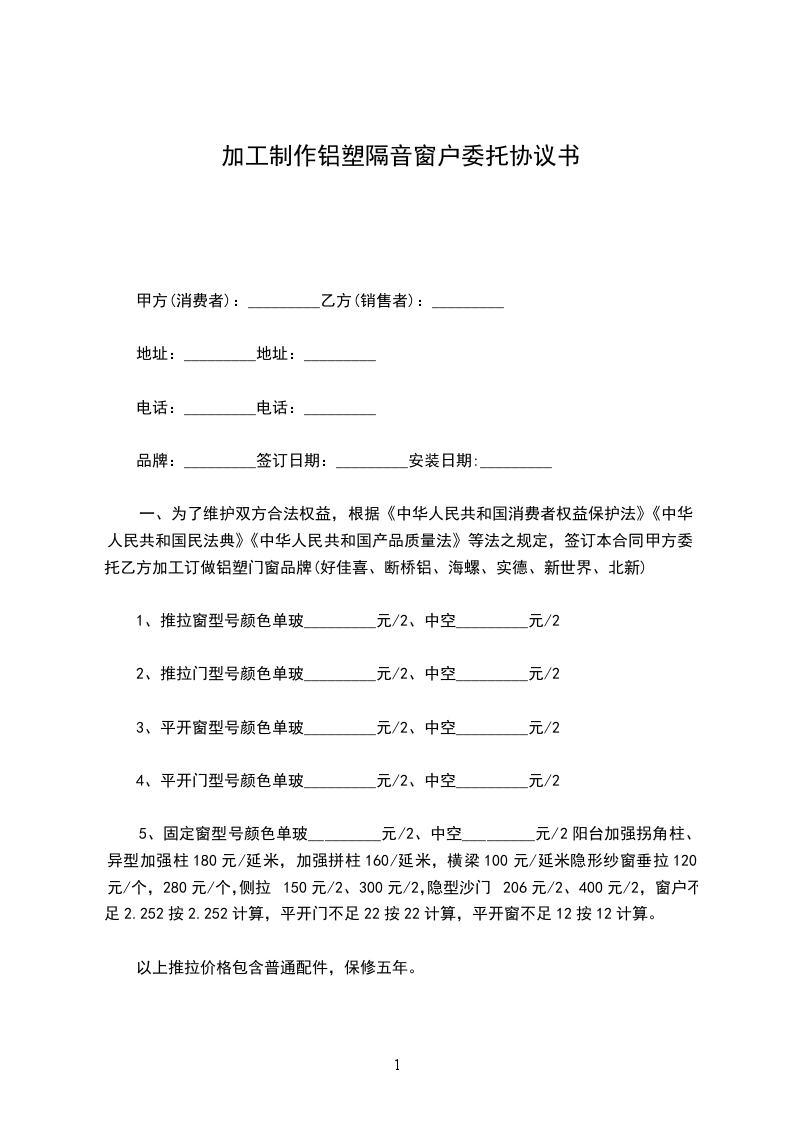 一、为了维护双方合法权益,根据《中华人民共和国消费者权益保护法》《中华人民共和国民法典》《中华人民共和国产品质量法》等法之规定,签订本合同甲方委托乙方加工订做铝塑门窗品牌(好佳喜、断桥铝、海螺、实德、新世界、北新)