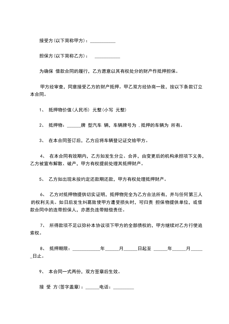 2.甲方必须连同与抵押车辆相关的钥匙、机动车登记证书、行车证、购车发票、购置税、养路费、保险单据、户口本原件及身份证复印件交由乙方或中间人保管。