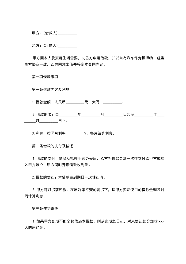 甲方因本人及家庭生活需要,向乙方申请借款,并以自有汽车作为抵押物,经当事方协商一致,乙方同意出借并签定本合同内容。