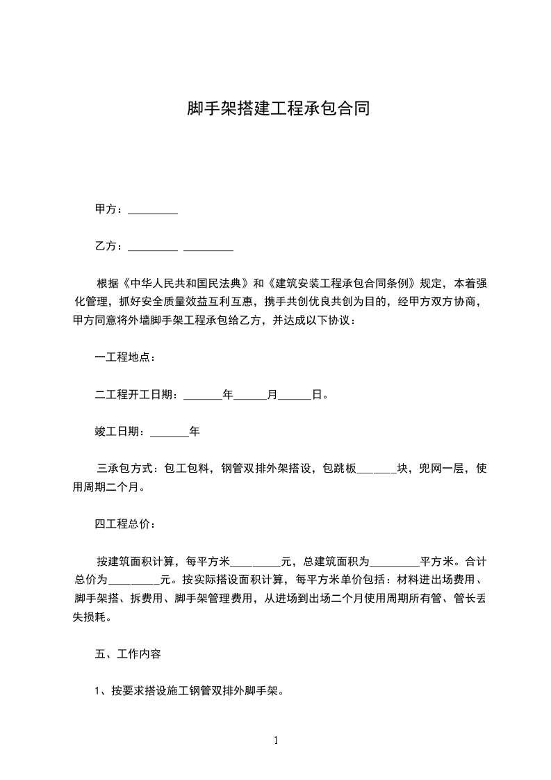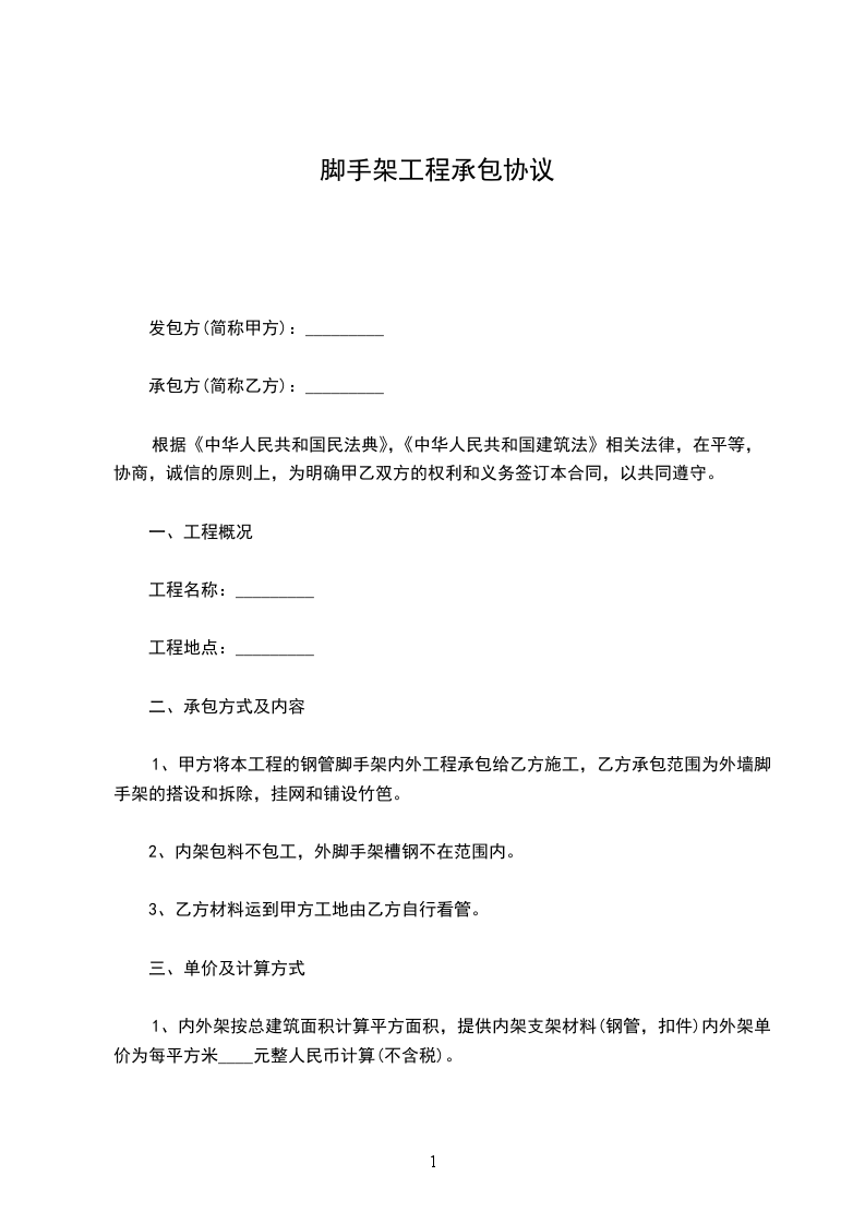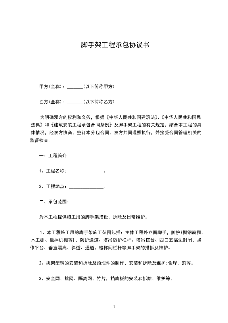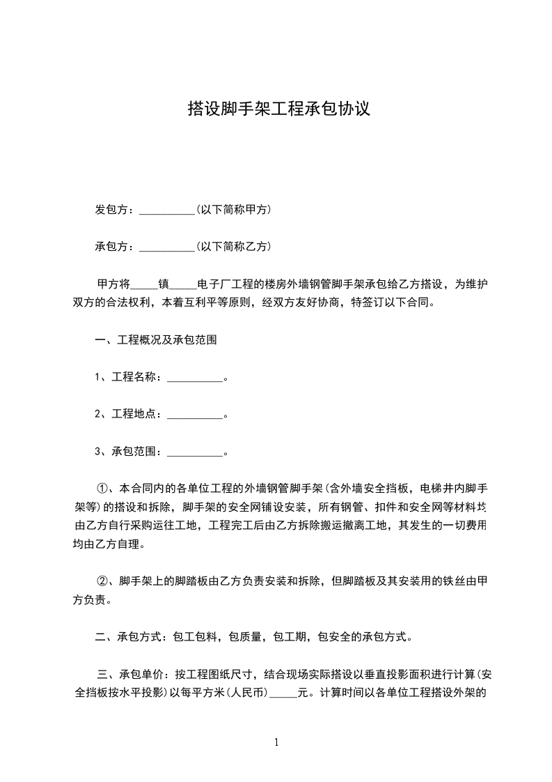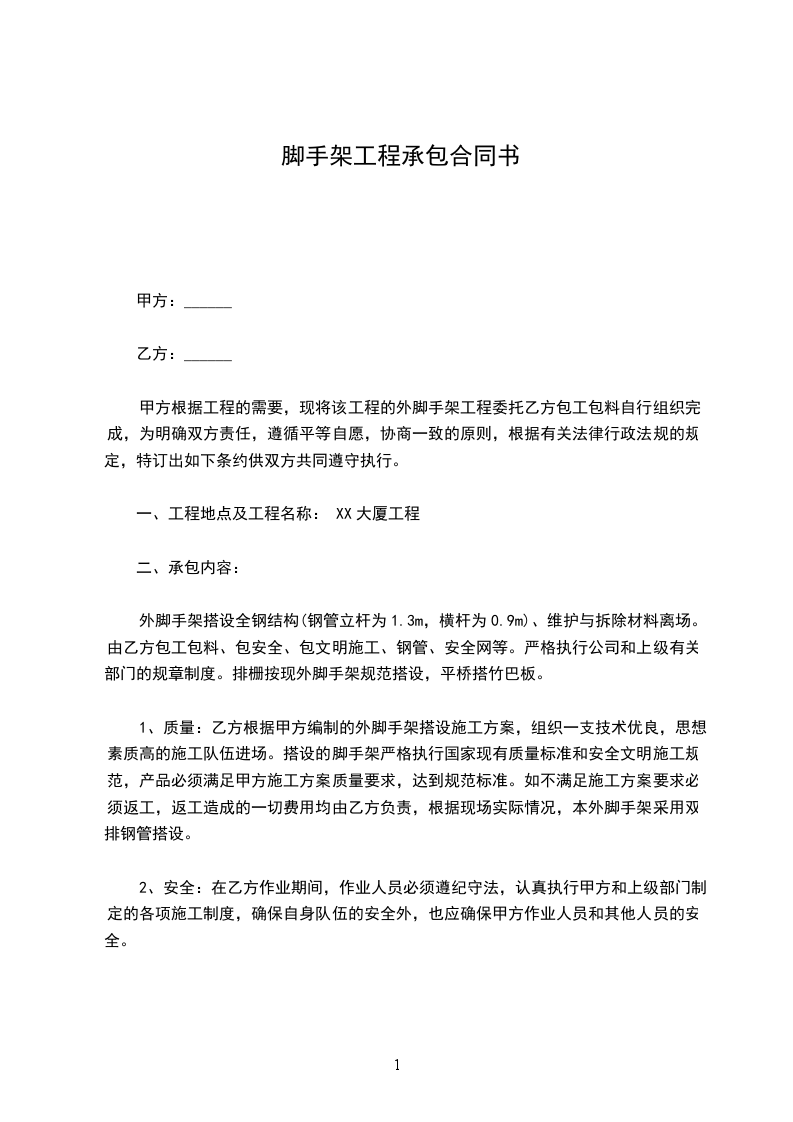 甲方根据工程的需要,现将该工程的外脚手架工程委托乙方包工包料自行组织完成,为明确双方责任,遵循平等自愿,协商一致的原则,根据有关法律行政法规的规定,特订出如下条约供双方共同遵守执行。