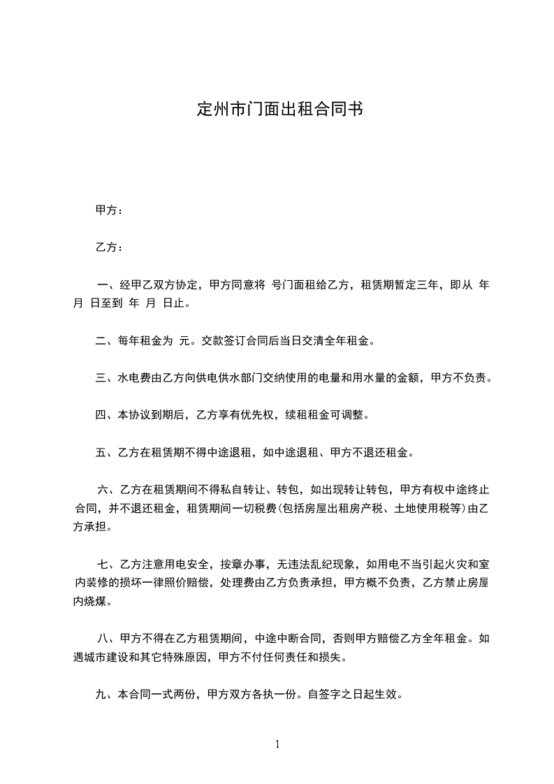 一、经甲乙双方协定,甲方同意将 号门面租给乙方,租赁期暂定三年,即从 年 月 日至到 年 月 日止。